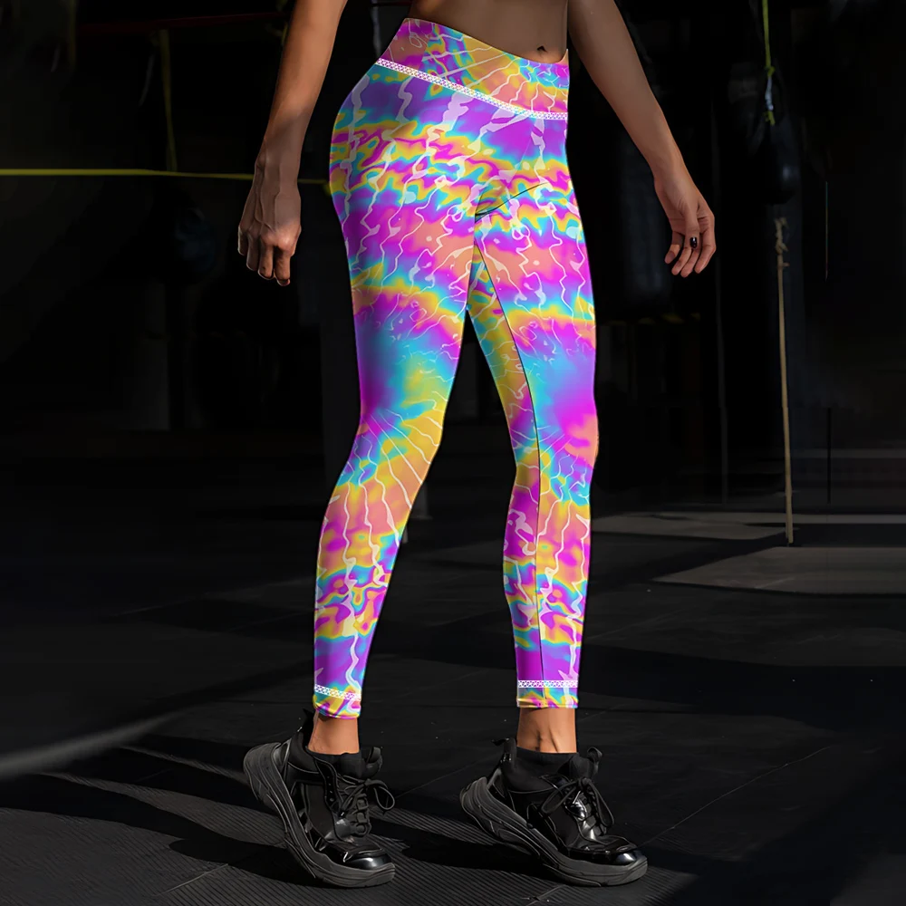 These vibrant tie-dye yoga pants combine bold 3D printed patterns with functional design for active wear. The high-rise elastic waistband provides secure support during workouts, while the skinny fit offers a flattering silhouette. Crafted for flexibility and comfort, these leggings transition seamlessly from gym sessions to casual outings. The eye-catching colorway makes a statement while premium fabric ensures durability through repeated wear and washing.