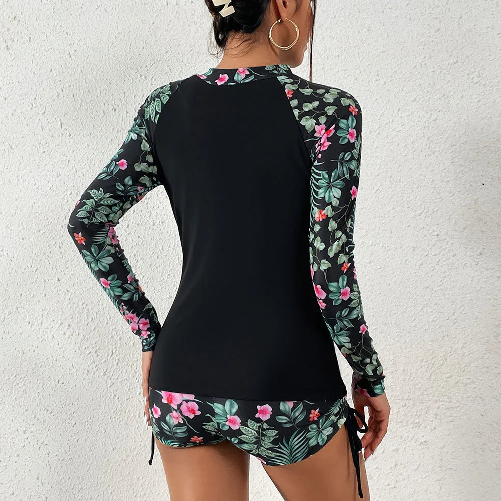 This two-piece tankini set features long sleeves for enhanced sun protection and is designed for active water sports like surfing and swimming. Crafted to offer comfort and flexibility, it provides excellent coverage while allowing freedom of movement. Ideal for beach or pool activities, this swimsuit combines performance with style to meet the needs of women seeking reliable swimwear for sports and leisure.