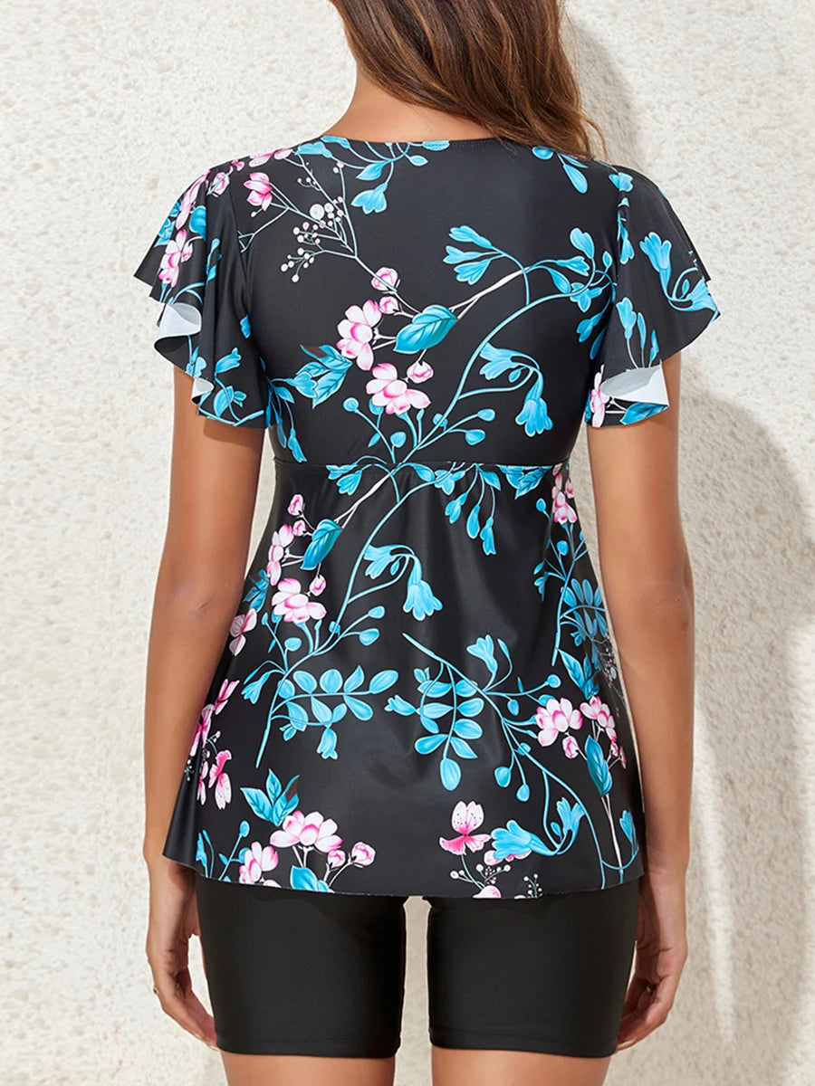 This floral tankini set features a stylish two-piece design with a ruffled top and high-waist shorts, offering both comfort and coverage. Crafted for a flattering fit, the swimsuit combines feminine detailing with practical support, making it ideal for beach or poolside wear. The high-waist shorts provide added confidence and ease of movement, while the floral pattern adds a fresh, vibrant touch to your swimwear collection. Perfect for women seeking a blend of fashion and function in their bathing suit.