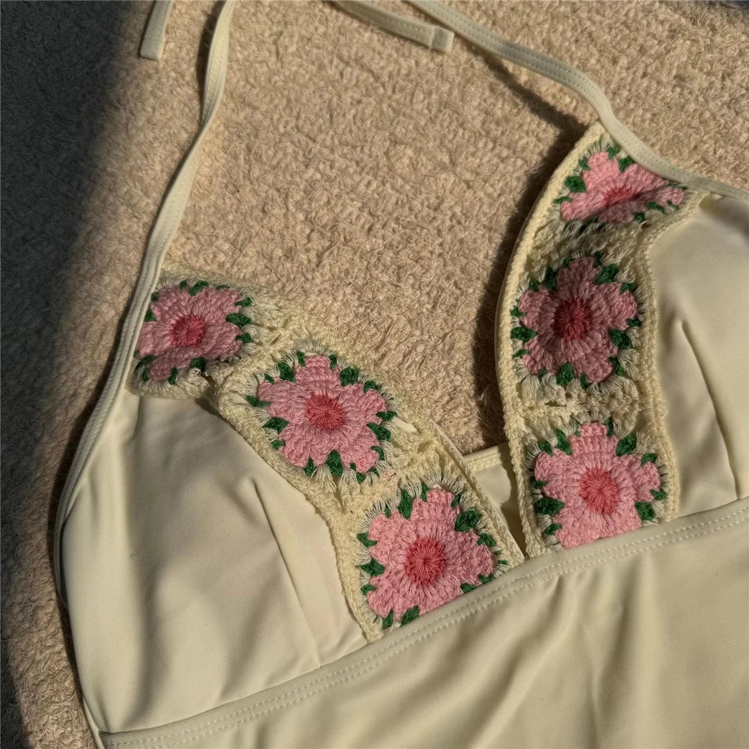 This two-piece bikini features a flattering V-neck halter design with a vibrant floral print, combining style and comfort for your swimwear collection. The padded cups provide gentle support and shape, while the adjustable halter straps ensure a secure fit. Ideal for beach days or poolside lounging, this swimsuit offers both elegance and functionality for confident, comfortable wear.