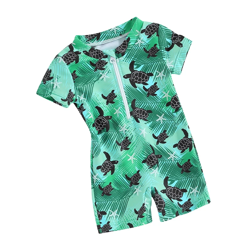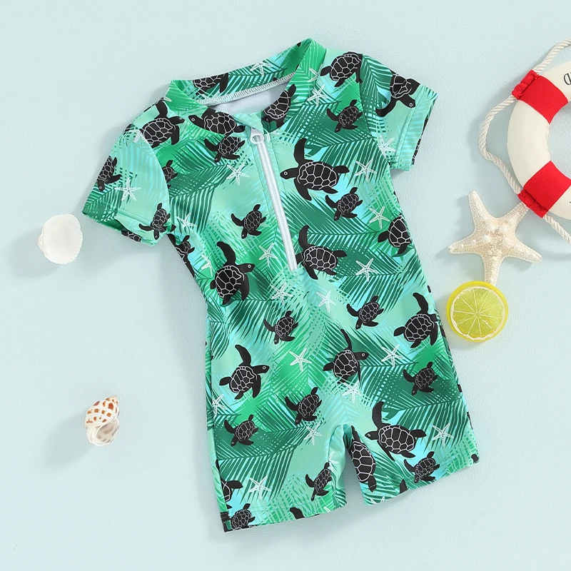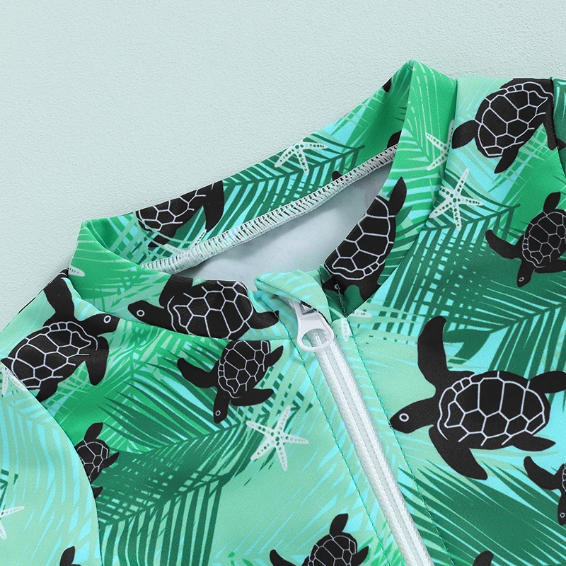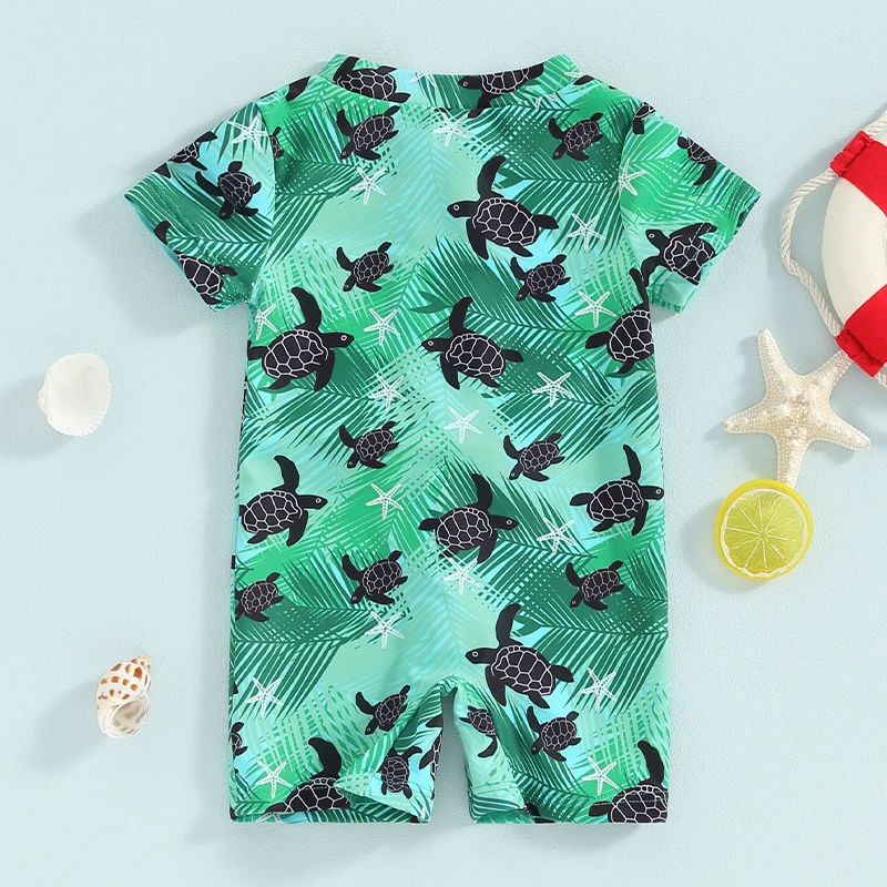 Toddler Boys Rash Guard Swimsuit Rompers Zipper Short Sleeve Turtle/Shark Print Kids Bathing Suit Baby Swimwear