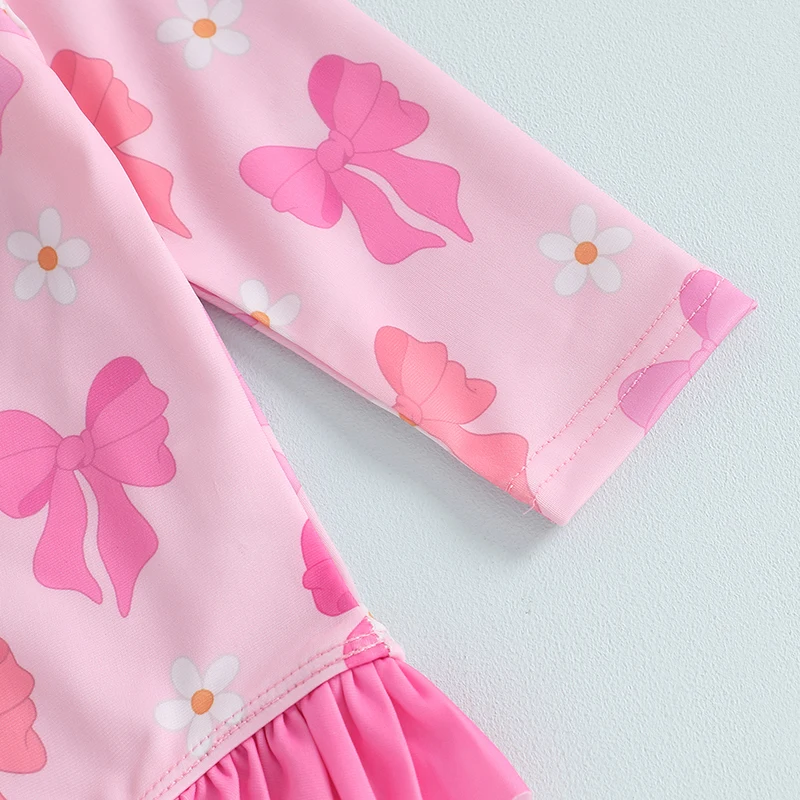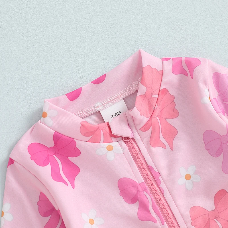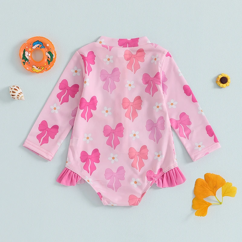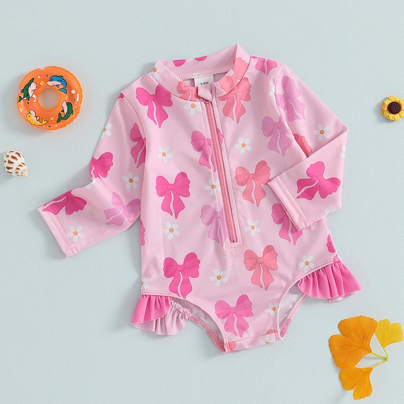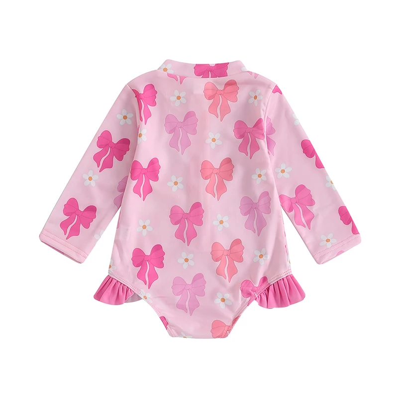 0-5Y Toddler Kids Girls Ruffle Swimsuit 2 Colors Bowknot Print Long Sleeve Zipper Rash Guard Bathing Suit Swimwear