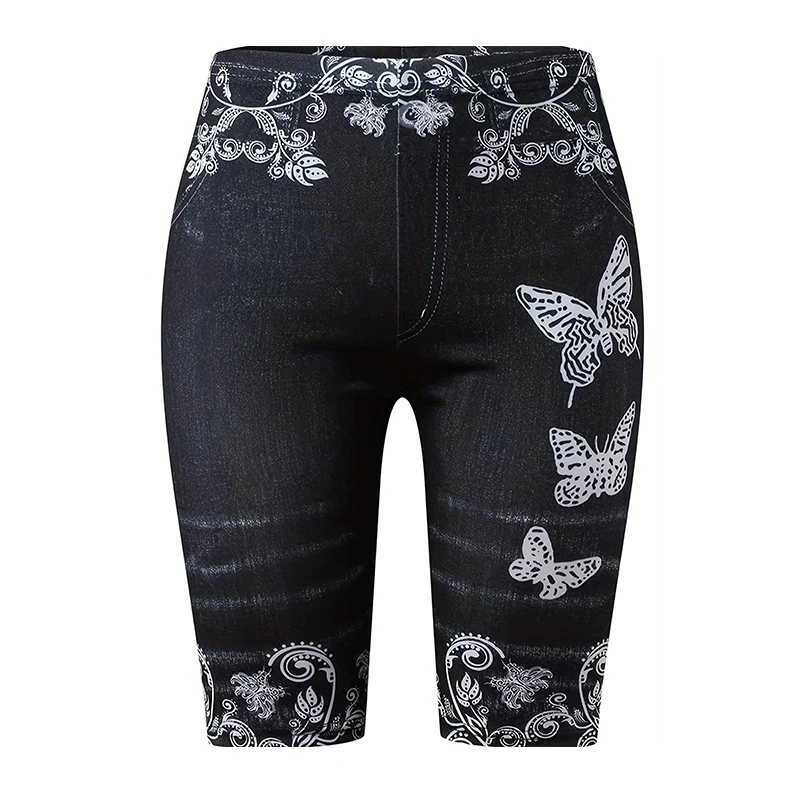 High-waisted leggings designed for versatility and comfort. These leggings feature faux denim construction with eye-catching floral and geometric patterns inspired by Y2K aesthetics. The supportive high-rise waistband provides coverage and stability, making them ideal for yoga, pilates, or everyday wear. The soft, stretchy fabric moves with your body while maintaining its shape through repeated wear. Whether you're heading to the studio or running errands, these statement leggings deliver both style and functional performance.