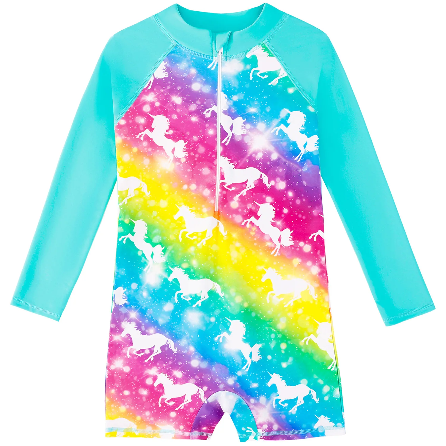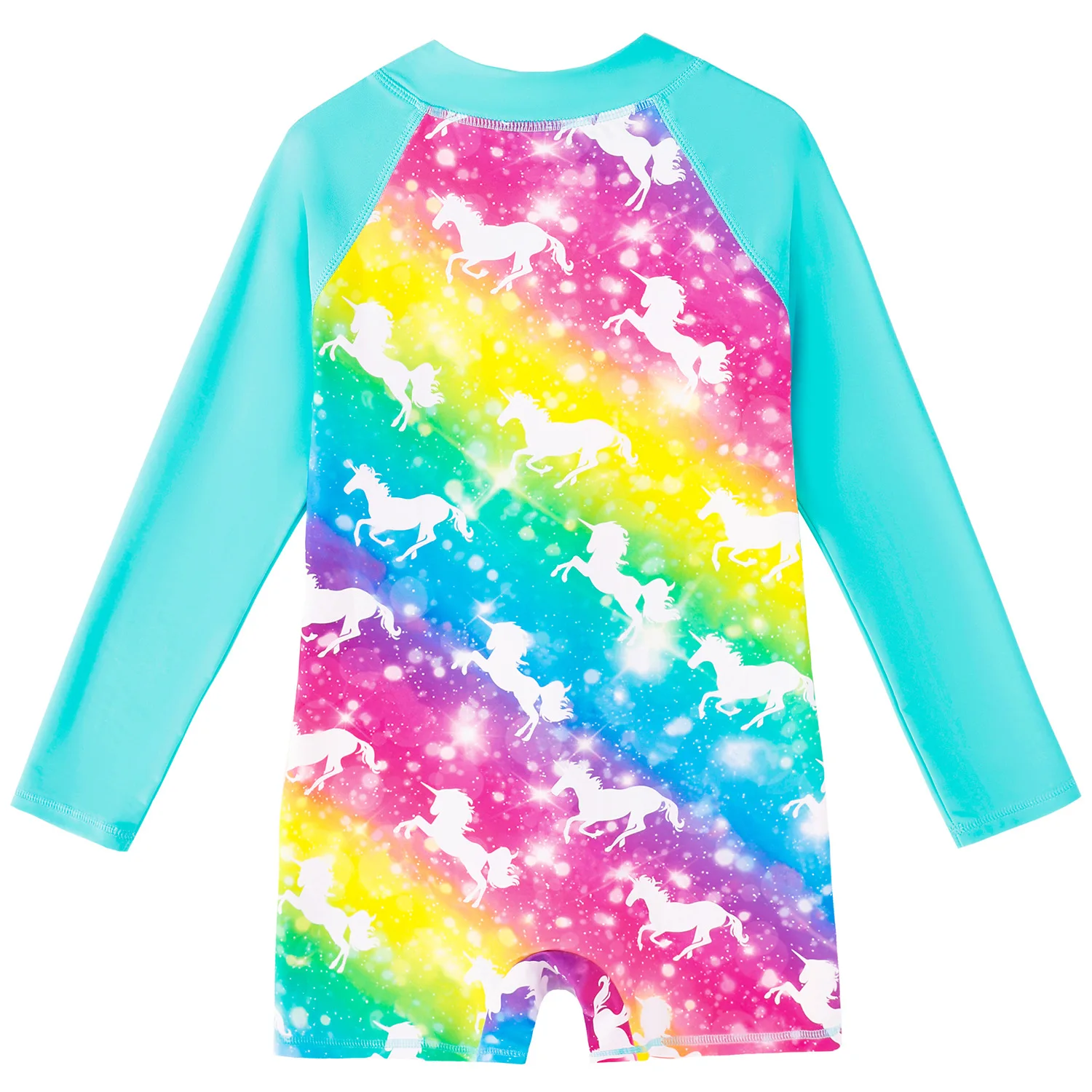 This one-piece rash guard combines sun protection with practical performance for young swimmers. The long sleeves shield delicate skin from UV rays while the quick-dry fabric keeps your daughter comfortable during extended pool and beach sessions. Designed for ages 2-10, the streamlined fit supports active water play without restriction. The durable construction withstands regular chlorine and saltwater exposure, making it an essential addition to any child's swimwear collection.