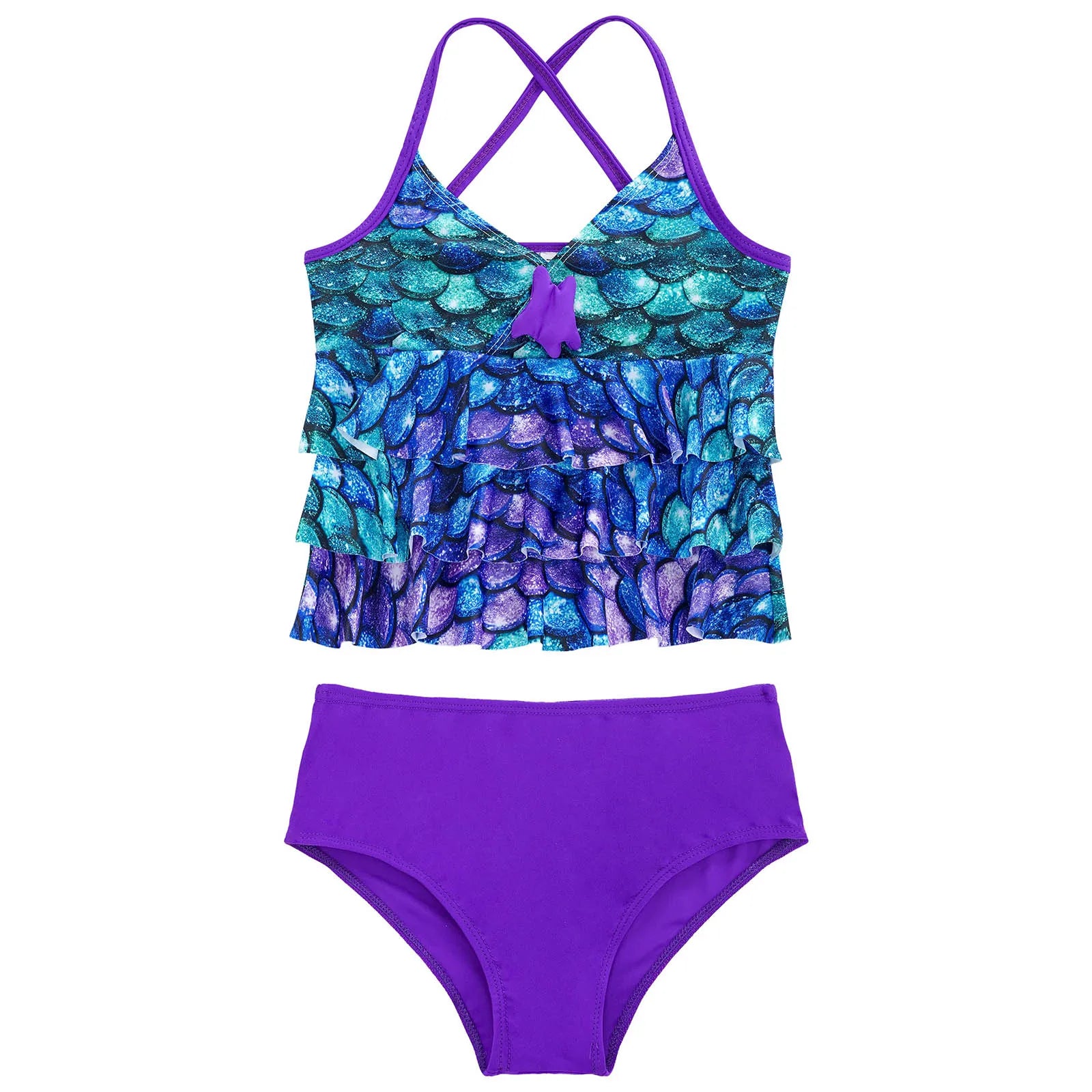 Spaghetti shoulder straps are criss cross at back, V-neckline with a stitched starfish. Swim tops front with 3 tiered ruffles, printed with scales pattern.