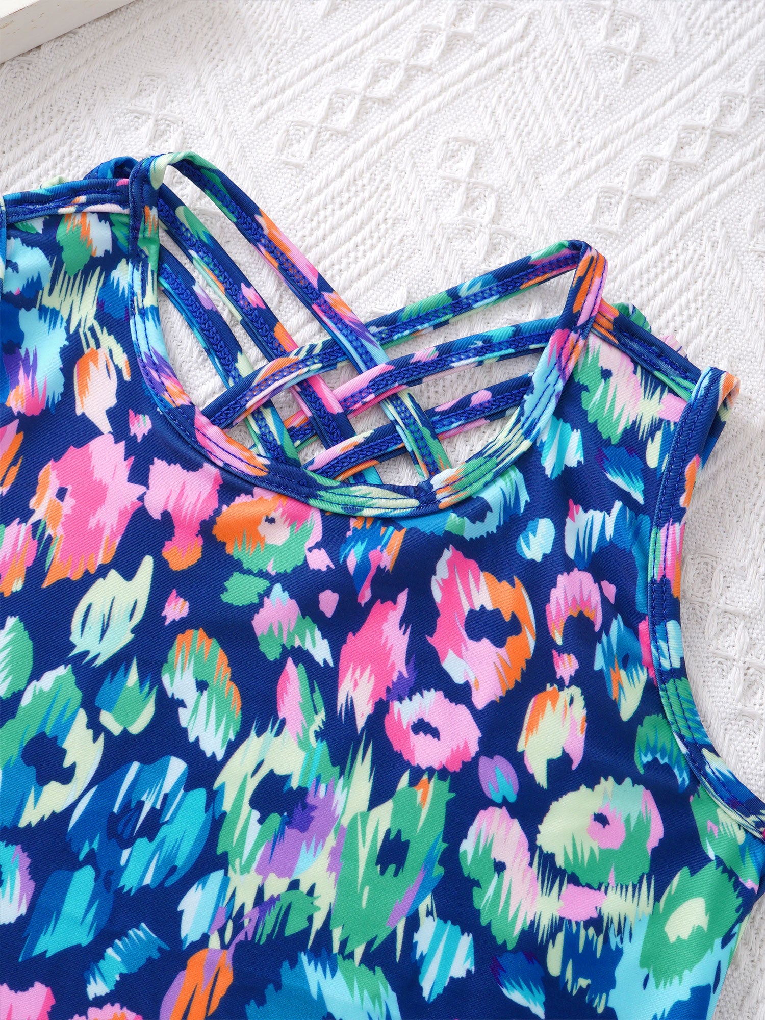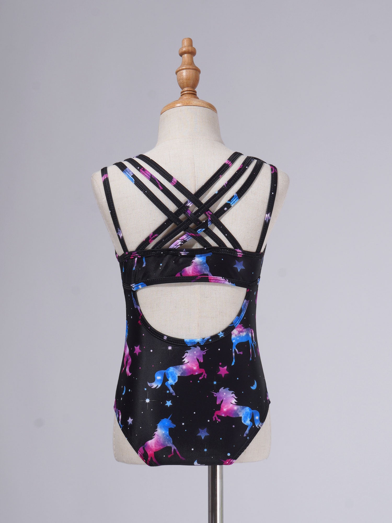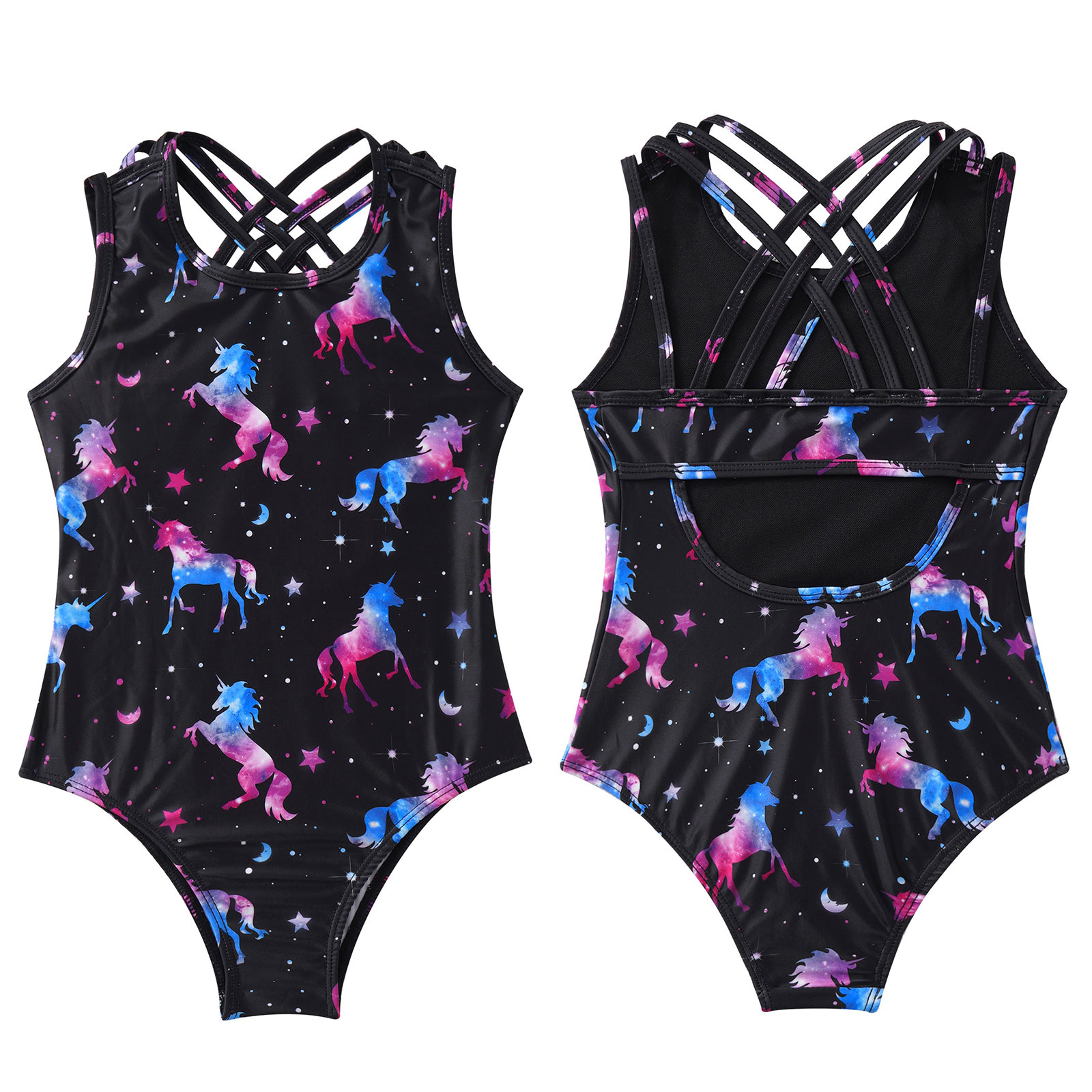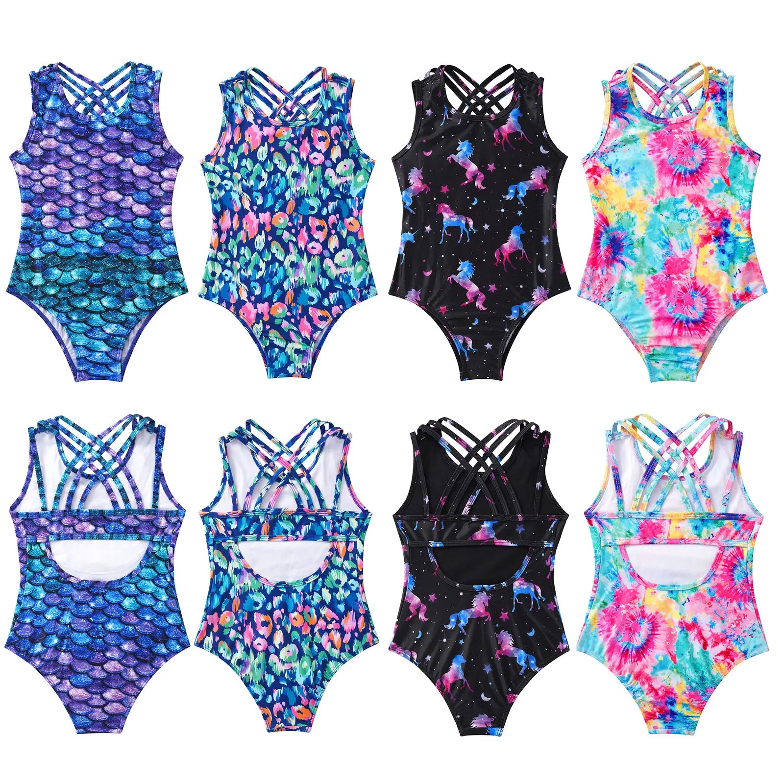 Kids Girls Straps Cross at Rear Keyhole Back Various Print Leotard Bodysuit.
