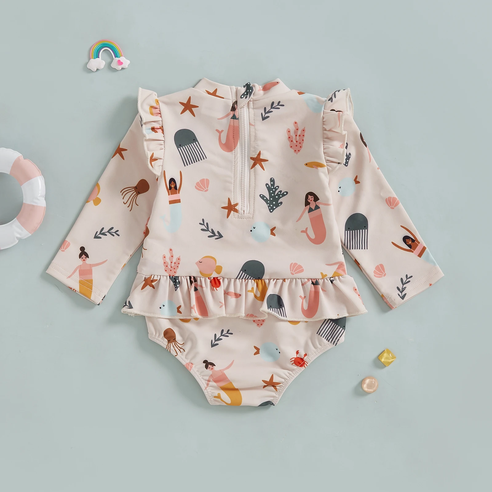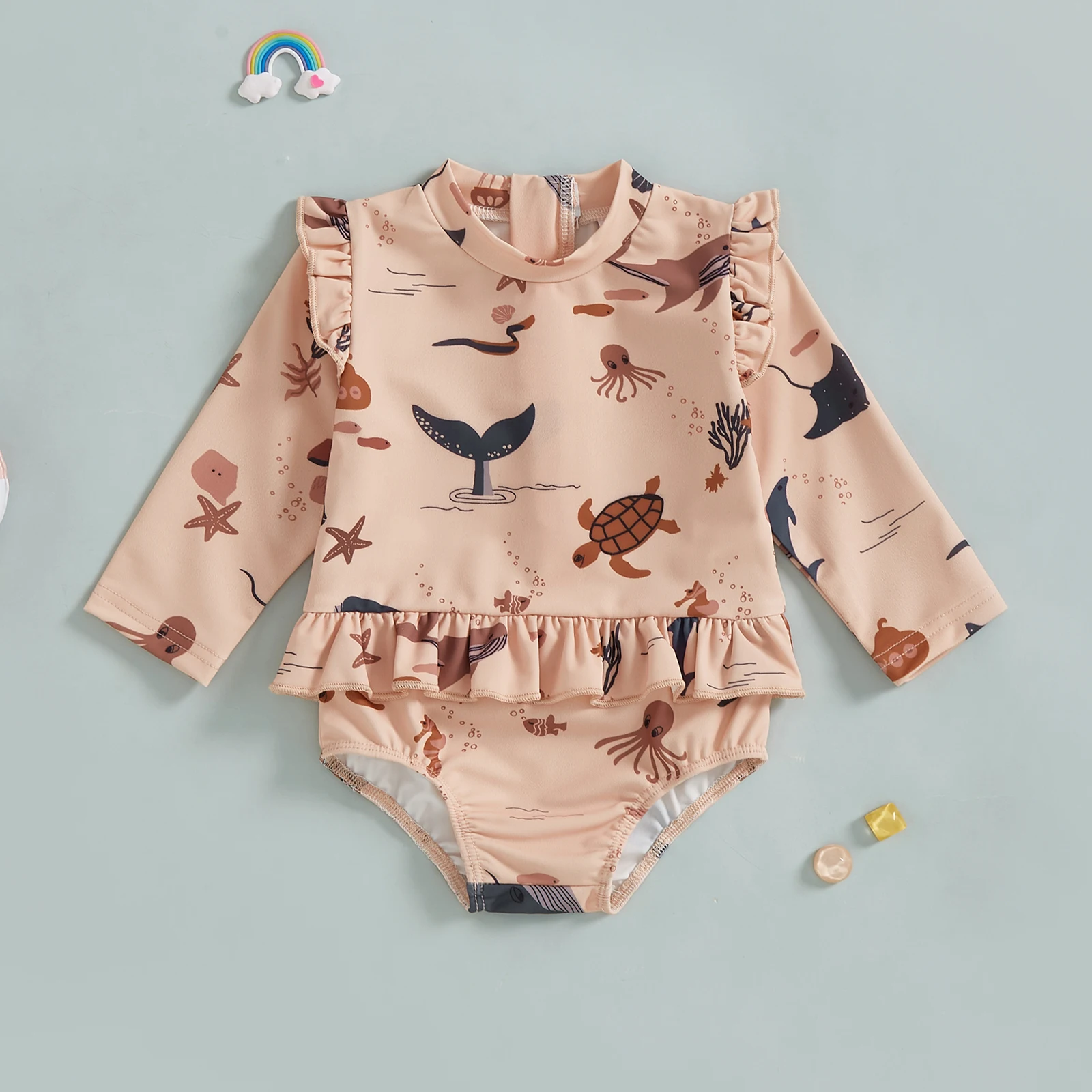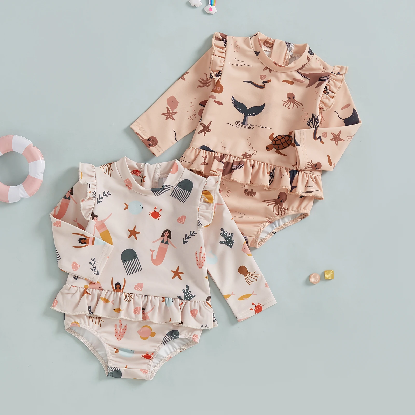 Baby Girls Long Sleeve Swimsuit Beachwear Ocean Elements Print Ruffle Toddler Infant Bathing Suit Swimwear