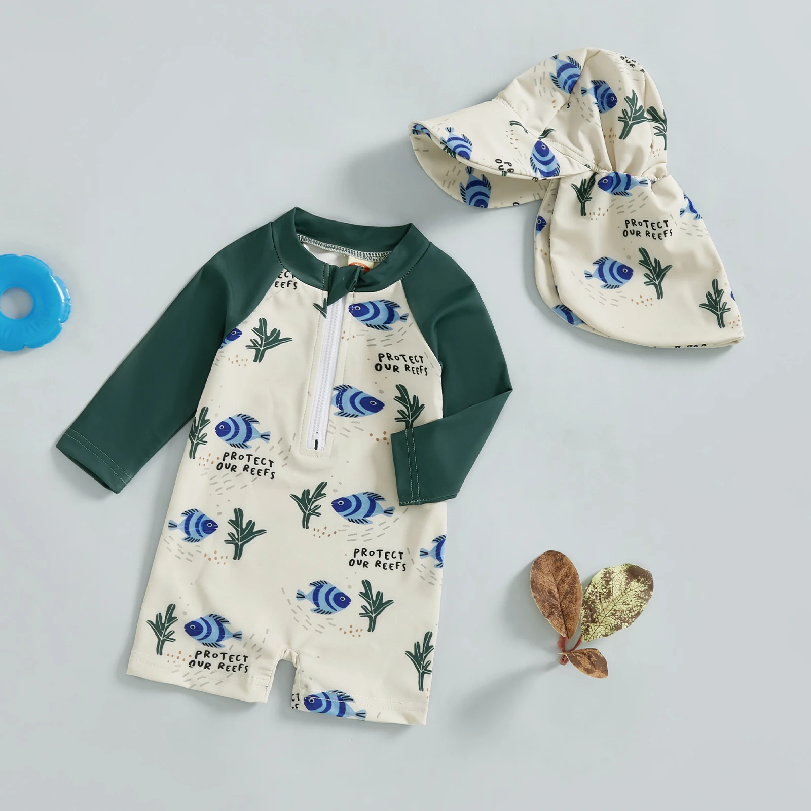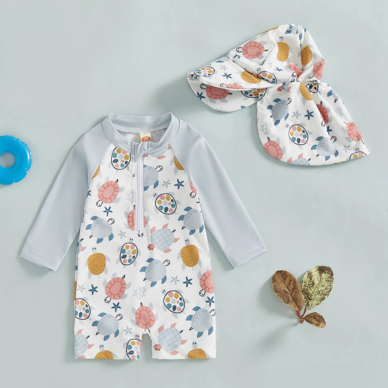 Keep your little swimmer protected and stylish with this charming long-sleeve boys' swimsuit set. Featuring playful cartoon fish and turtle prints that appeal to young imaginations, the suit combines sun-safe coverage with comfort for extended water play. The included matching hat provides additional UV protection for sensitive skin. Crafted for active children, this two-piece set is ideal for beach days, pool sessions, and water adventures. Easy to care for and designed to withstand regular swimming, it's a practical choice for parents seeking both safety and fun in their child's beachwear collection.