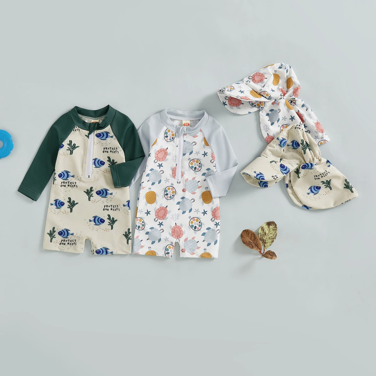 Long Sleeve Kids Baby Boys Swimsuits with Hats Cute Cartoon Fish/Turtle Print Children Swimming Suit Beach Wear