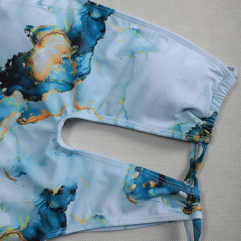 Marble Print One Shoulder Women Swimwear One Piece Swimsuit Female Monokini Bather High Cut Out Bathing Suit Swim