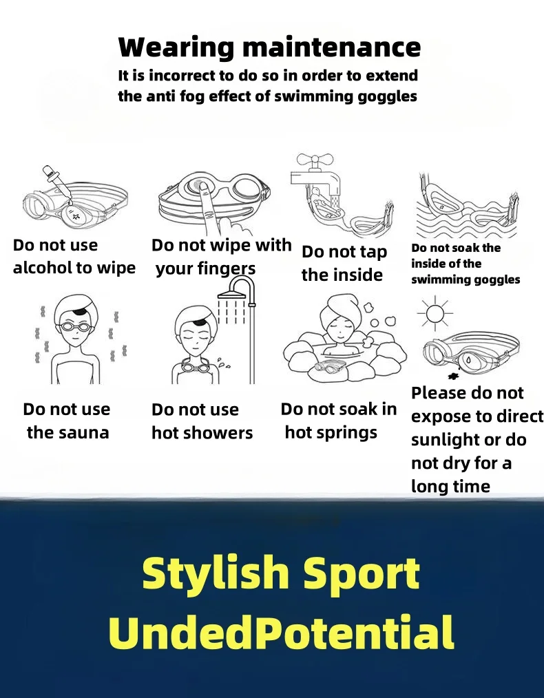 Adult Swimming Goggles with Anti-Fog HD Lenses Experience crystal-clear underwater vision with these premium adult swimming goggles, engineered for serious swimmers. The advanced anti-fog coating maintains visibility throughout your entire session, while high-definition lenses deliver sharp, distortion-free optics. The adjustable large frame accommodates various face shapes for a secure, comfortable fit, and integrated silicone earplugs provide additional water protection. Built for performance and durability, these goggles are an essential choice for lap swimmers and water enthusiasts seeking reliable eye protection and superior optical clarity.