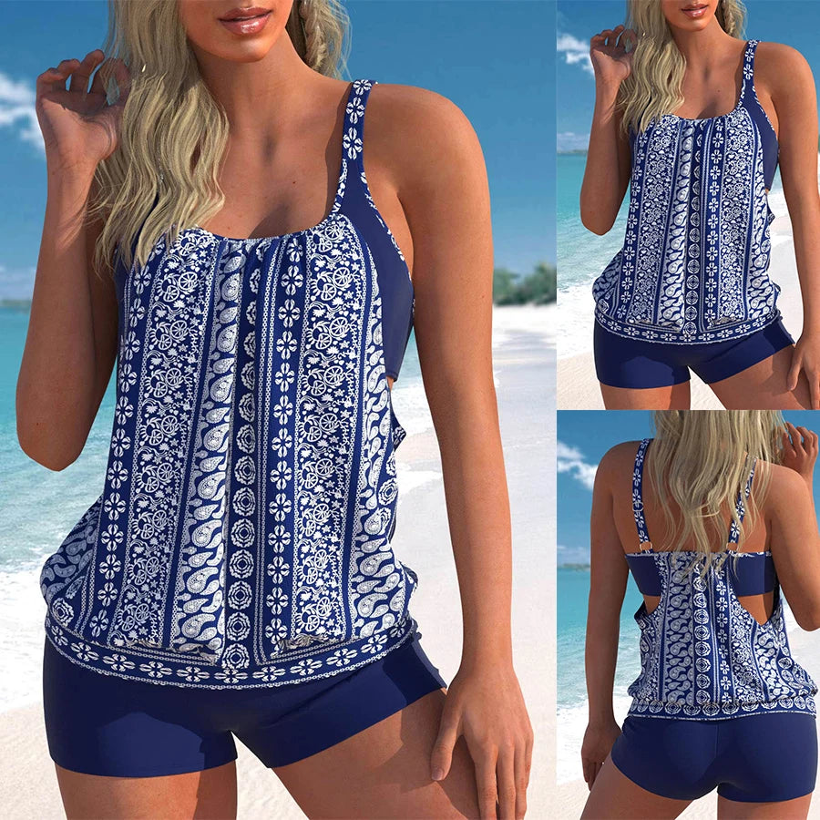 This women's two-piece swimsuit features a deep blue vintage floral print, combining classic elegance with modern style. Designed with a lace-up front and hollow details, it offers adjustable fit and subtle allure. Available in sizes S to 6XL, it ensures comfortable wear for a wide range of body types, making it an ideal choice for beach outings or poolside relaxation.