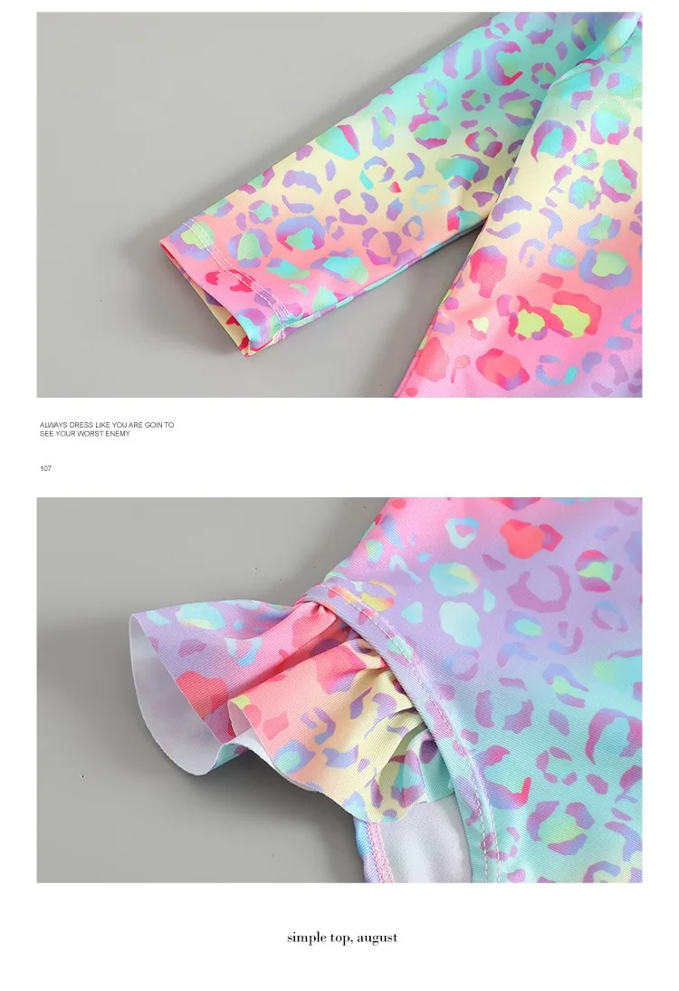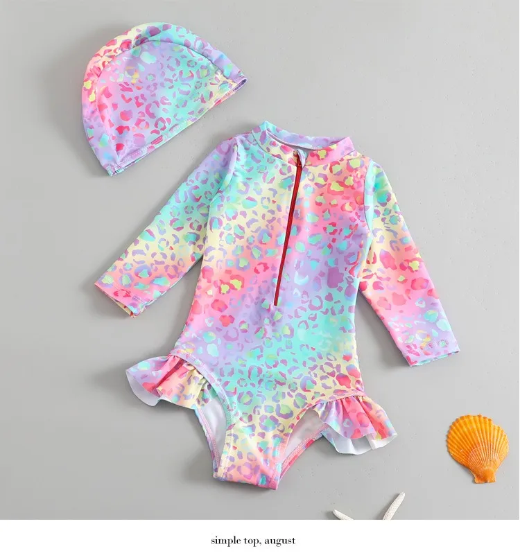Long Sleeves Girls' Swimsuit With Hat Beachwear Surf One Pieces Colour Ruffle Kids Girls Summer Swimsuits Princess