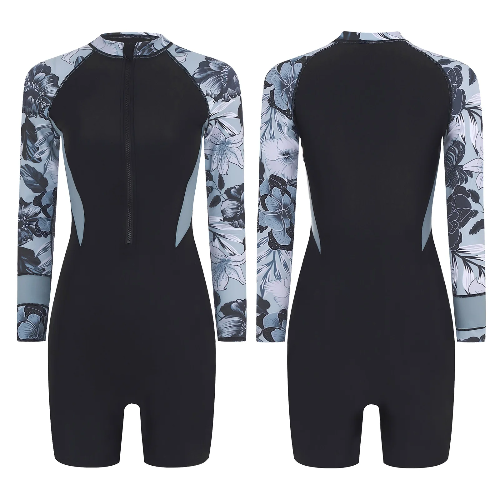 One Piece Floral Print Athletic Swimsuit Swimwear for Women Long Sleeve Zip Front Tropical Plant Surfing Sun Protection Bodysuit
