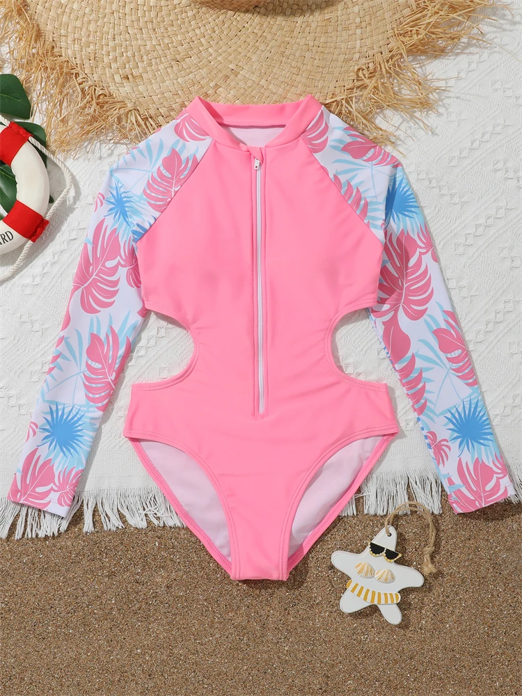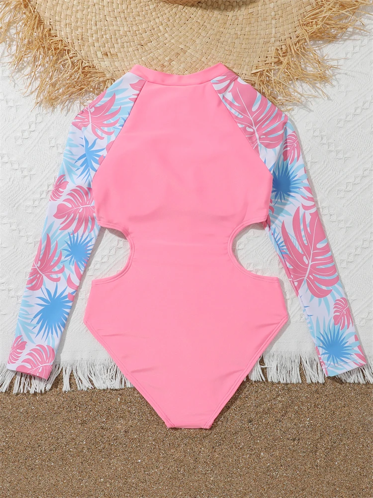 One Piece Girls Swimsuit Pink Print Long Sleeve Children Swimwear Summer Hollow Out Kids Beach Swimming Bathing Suit