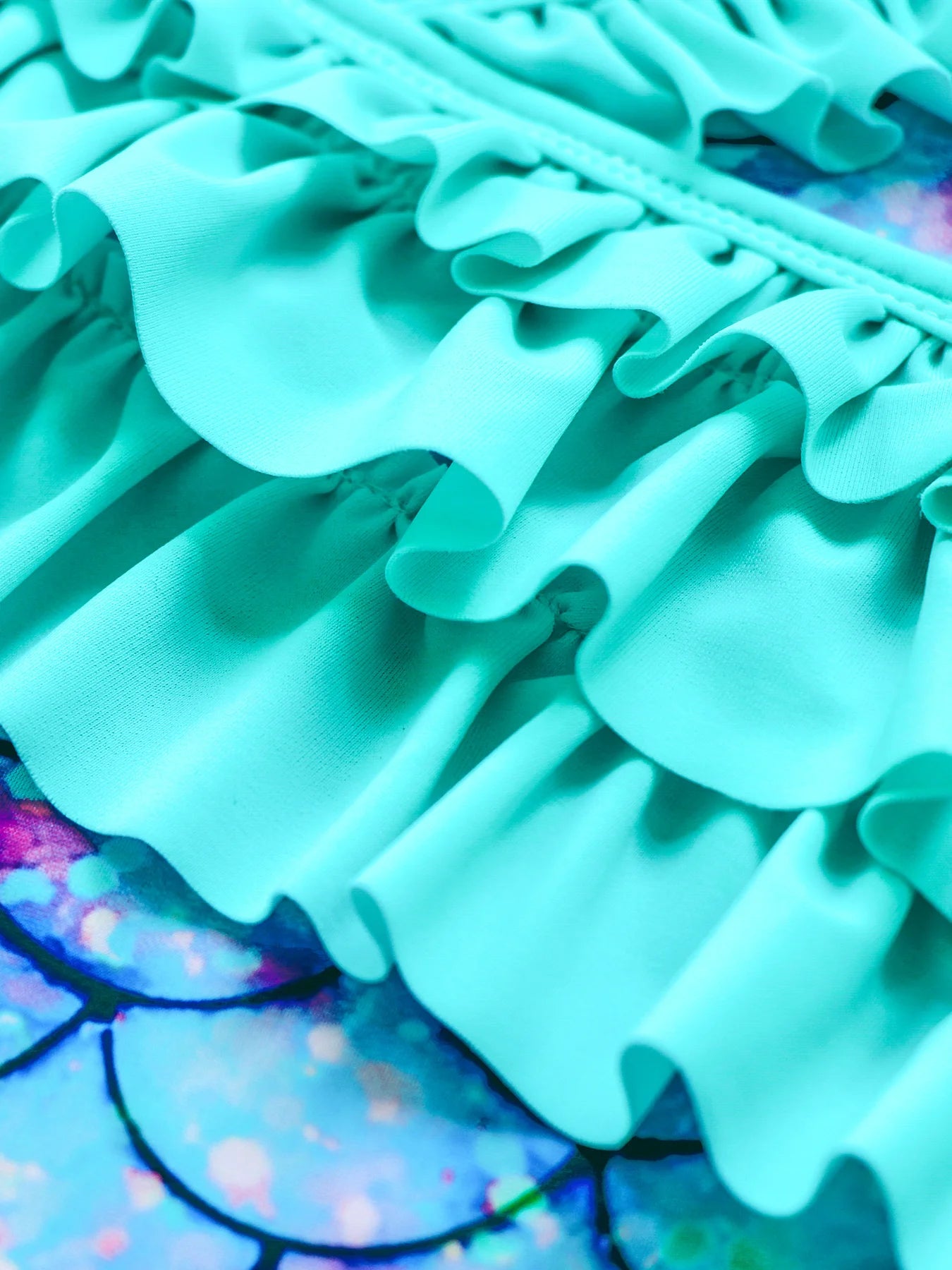 Make a splash this summer in this charming one-piece swimsuit designed for active young swimmers. Featuring a flattering bikini cut with playful ruffle frills and an eye-catching shimmering scale print, it combines style with practicality. The thin cross-back straps provide secure support and freedom of movement, while the lightweight construction ensures comfort during extended water play. Perfect for beach days, pool parties, or swimming lessons, this versatile piece transitions seamlessly from water to casual wear.