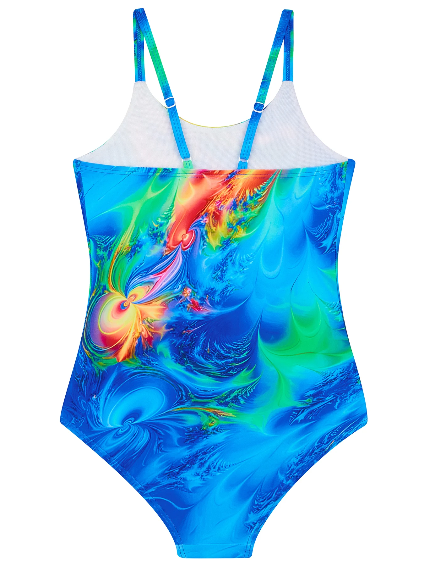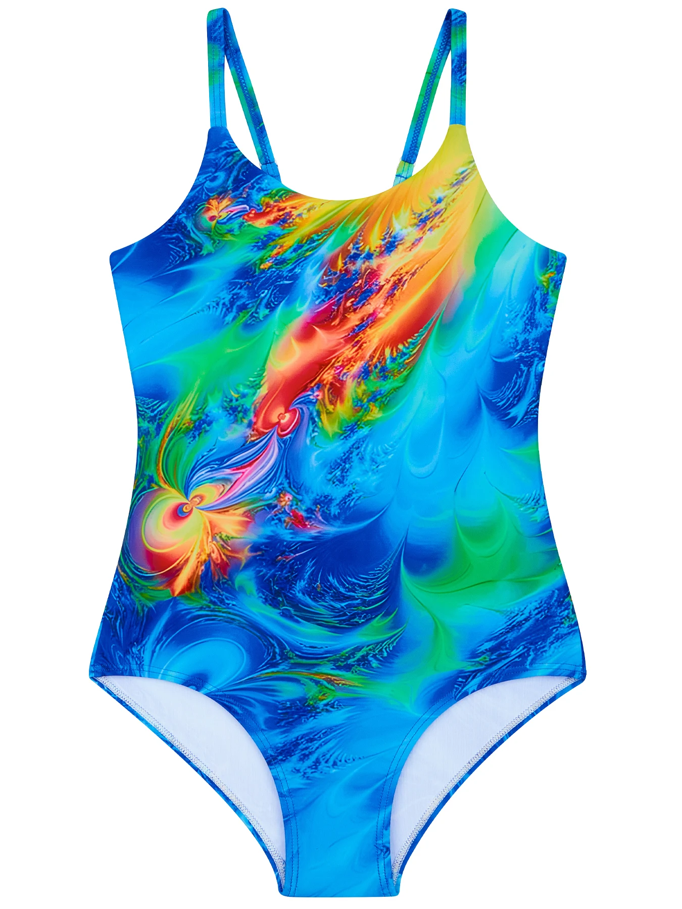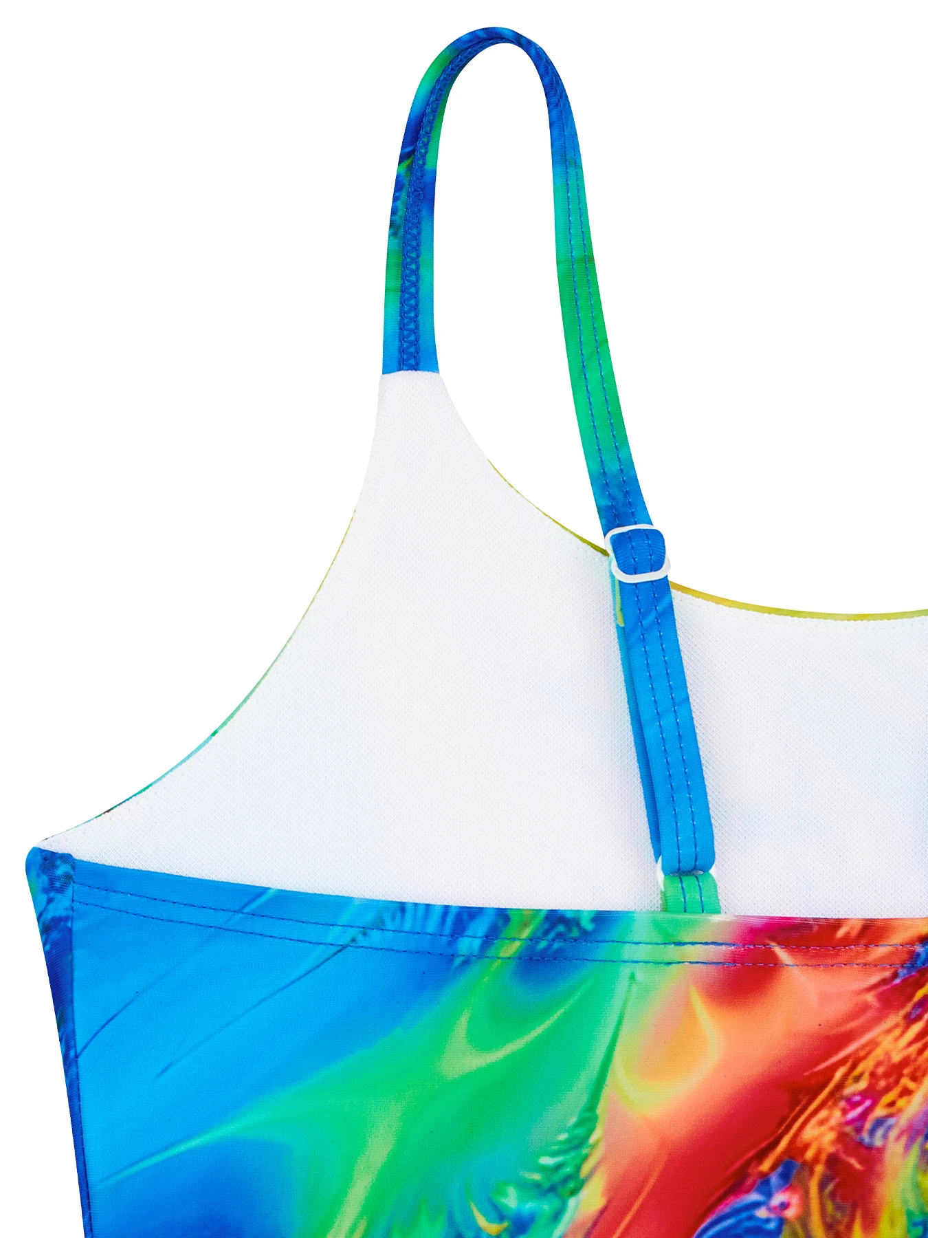 This vibrant one-piece swimsuit combines style and practicality for young swimmers. Featuring an eye-catching allover colorful print, it delivers visual appeal that kids love. The sleeveless design offers freedom of movement for active play, while the bikini-cut bottom provides a modern silhouette. Crafted for comfort during beach and pool sessions, this toddler-friendly piece is an essential addition to any child's summer wardrobe. Durable construction ensures it withstands regular water activities and chlorine exposure.