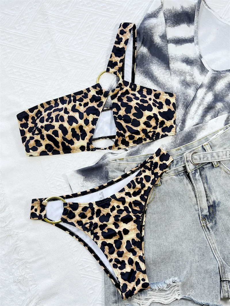 Leopard Print Bikini Set with Ring Thong Swimsuit Halter Women Swimwear Hollow Out Two-pieces Bathing Suit