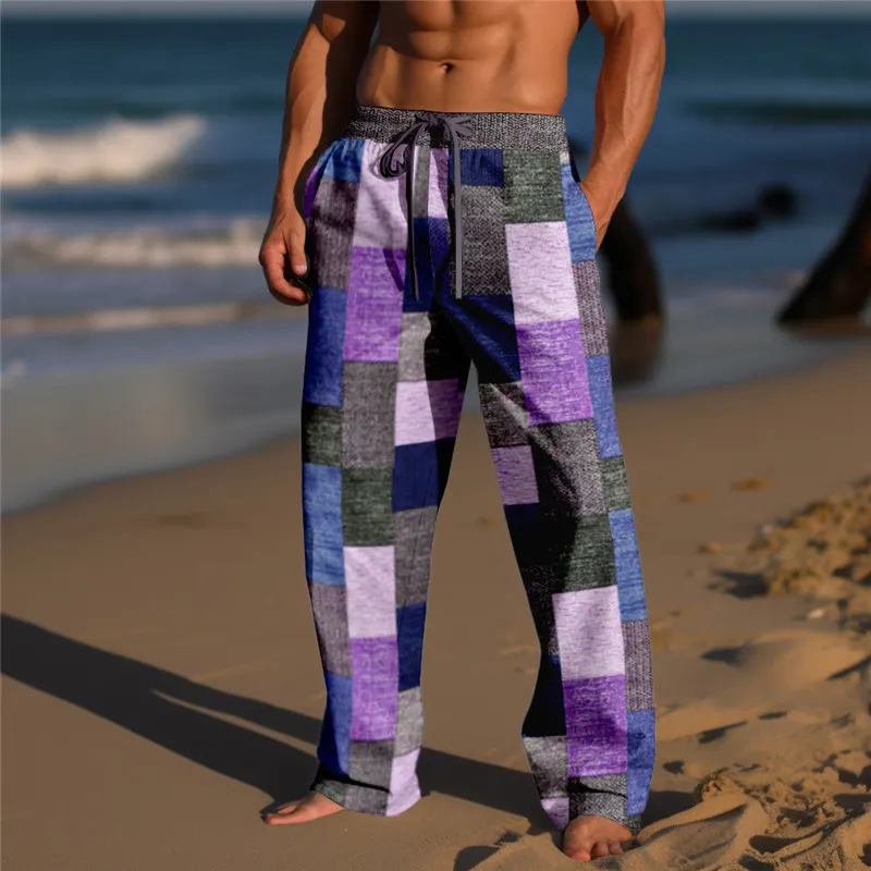 Plaid Color Block Men's Resort 3D Printed Casual Pants Trousers Elastic Waist Fit Straight-Leg Pant Summer Beach Pants 5XL