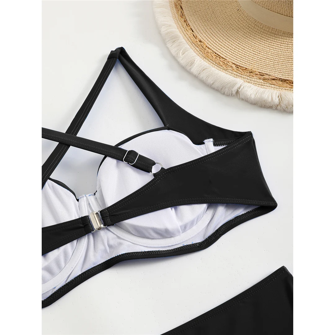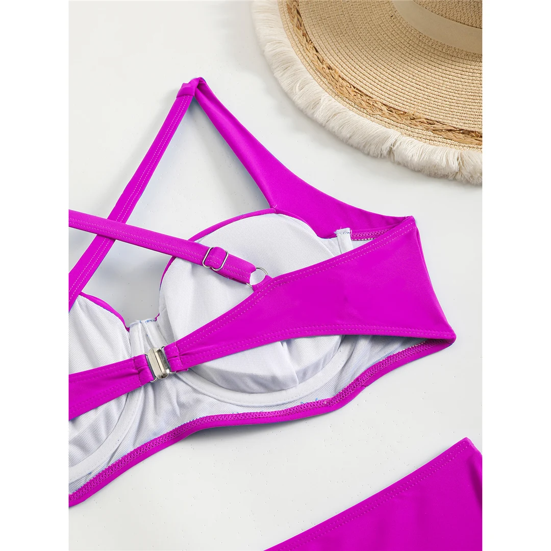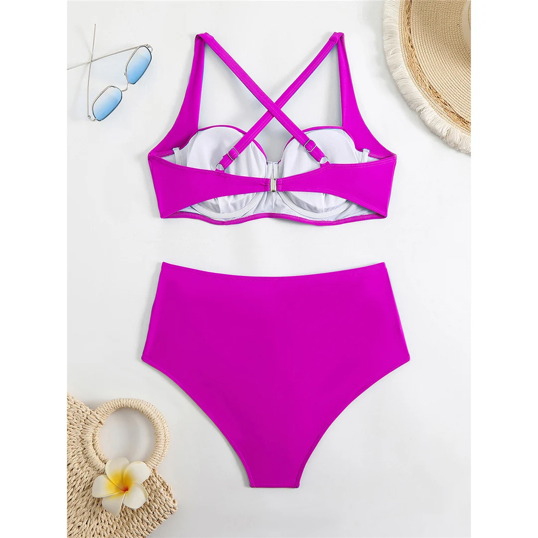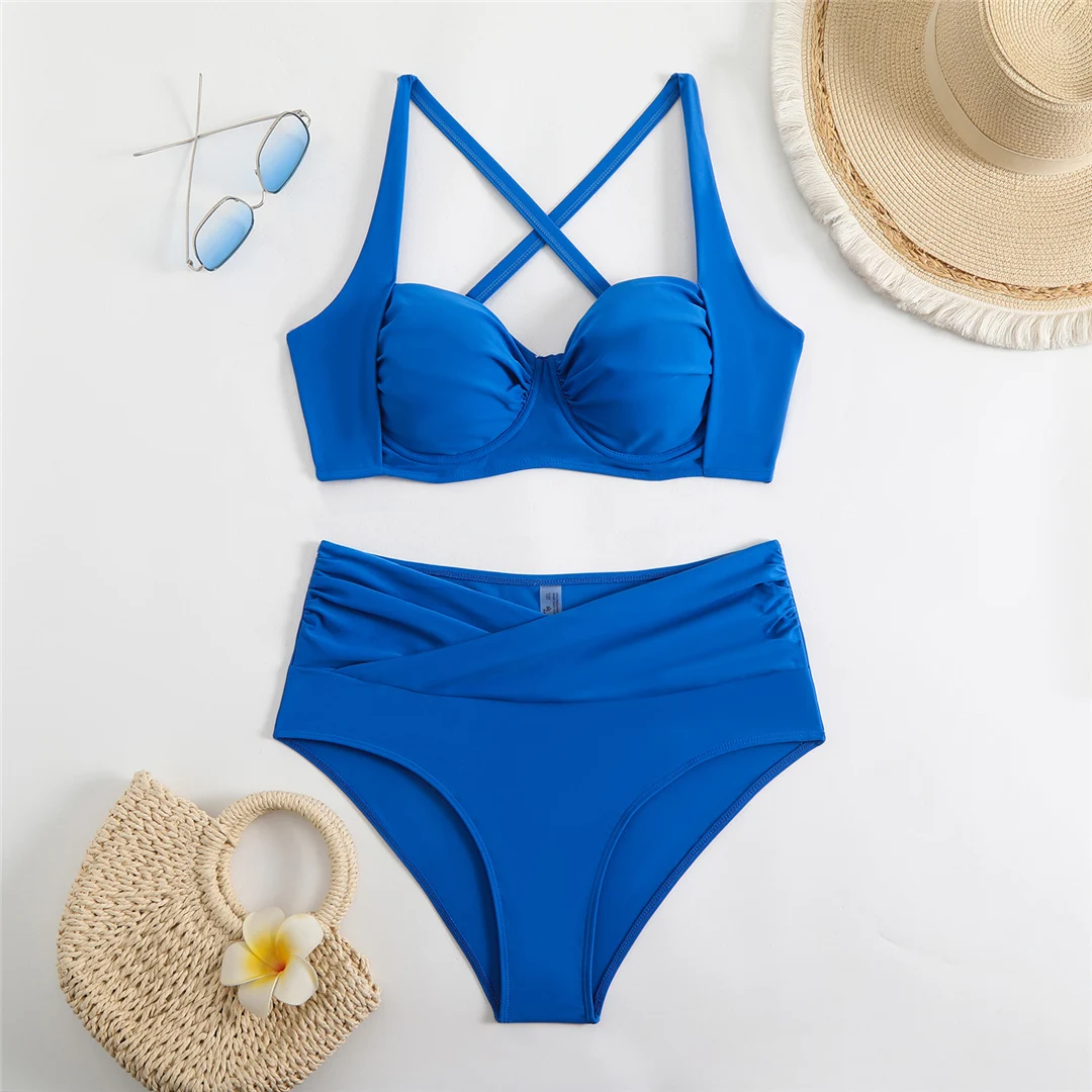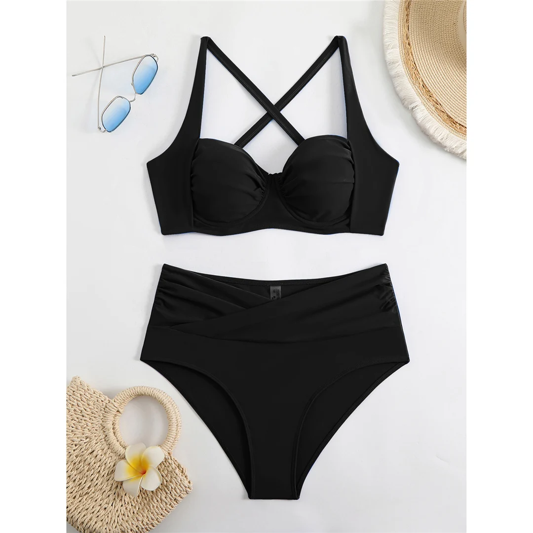 This two-piece bikini set features a pleated design with underwired, padded cups for enhanced support and shape. The high-waist bottoms provide comfortable coverage while flattering your silhouette. Crafted for both style and function, this swimwear combines elegance with reliable fit, making it ideal for confident swimming and sunbathing.