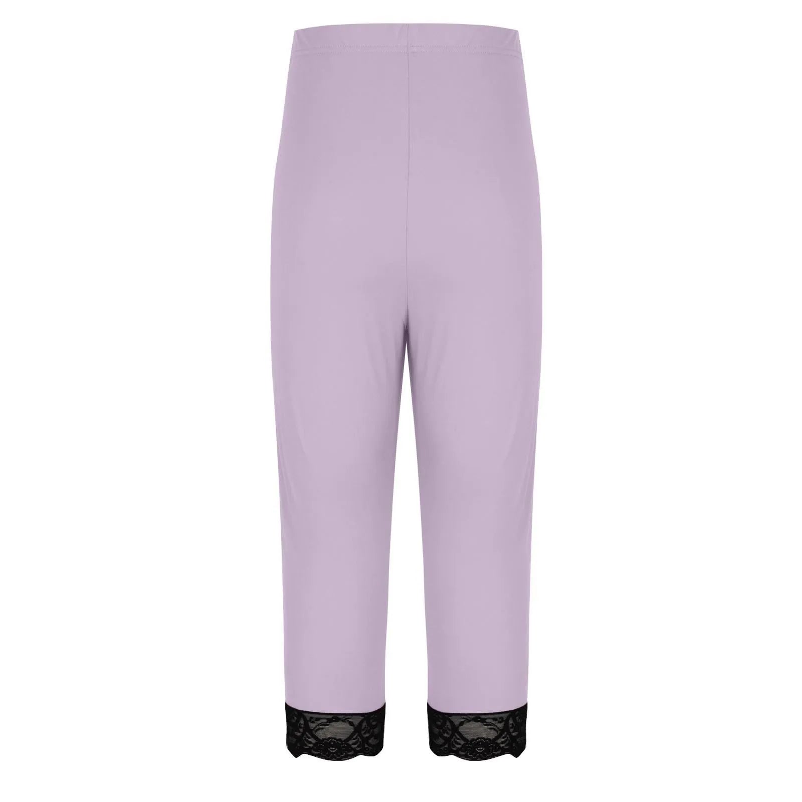 Designed for comfort and style, these plus-size yoga pants feature a flattering elastic waist that moves with you through every pose and workout. The solid colour base pairs beautifully with delicate lace splicing at the hem, adding an elegant touch to your activewear collection. The cropped length offers versatility for both studio sessions and casual wear, while the breathable fabric supports your natural range of motion. Perfect for those seeking quality sportswear that doesn't compromise on sophistication.