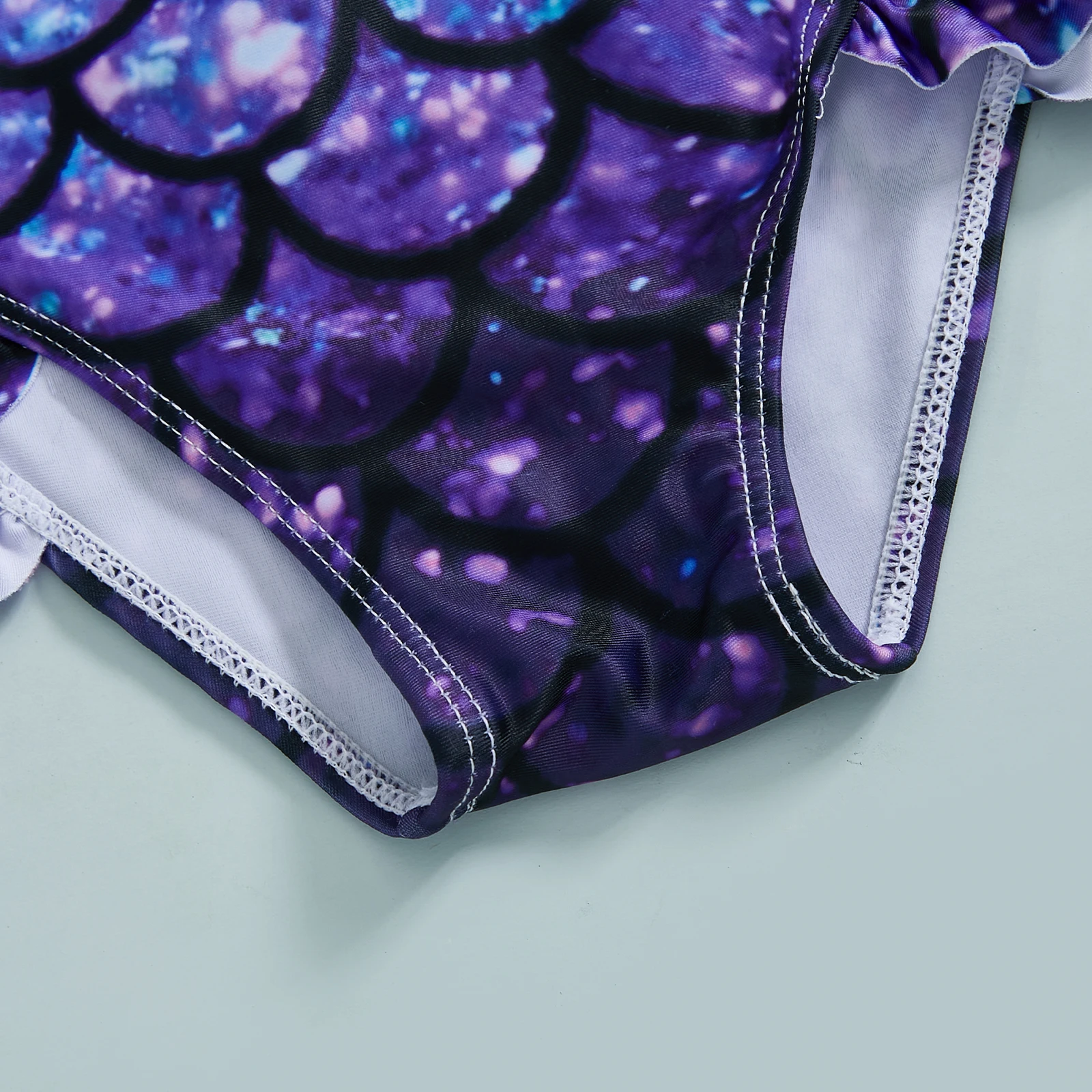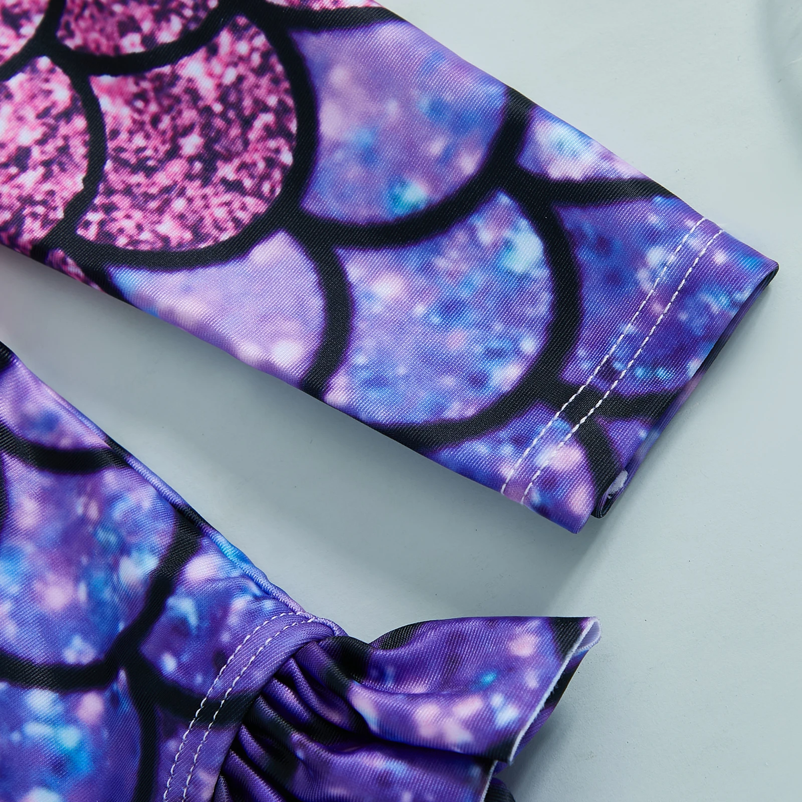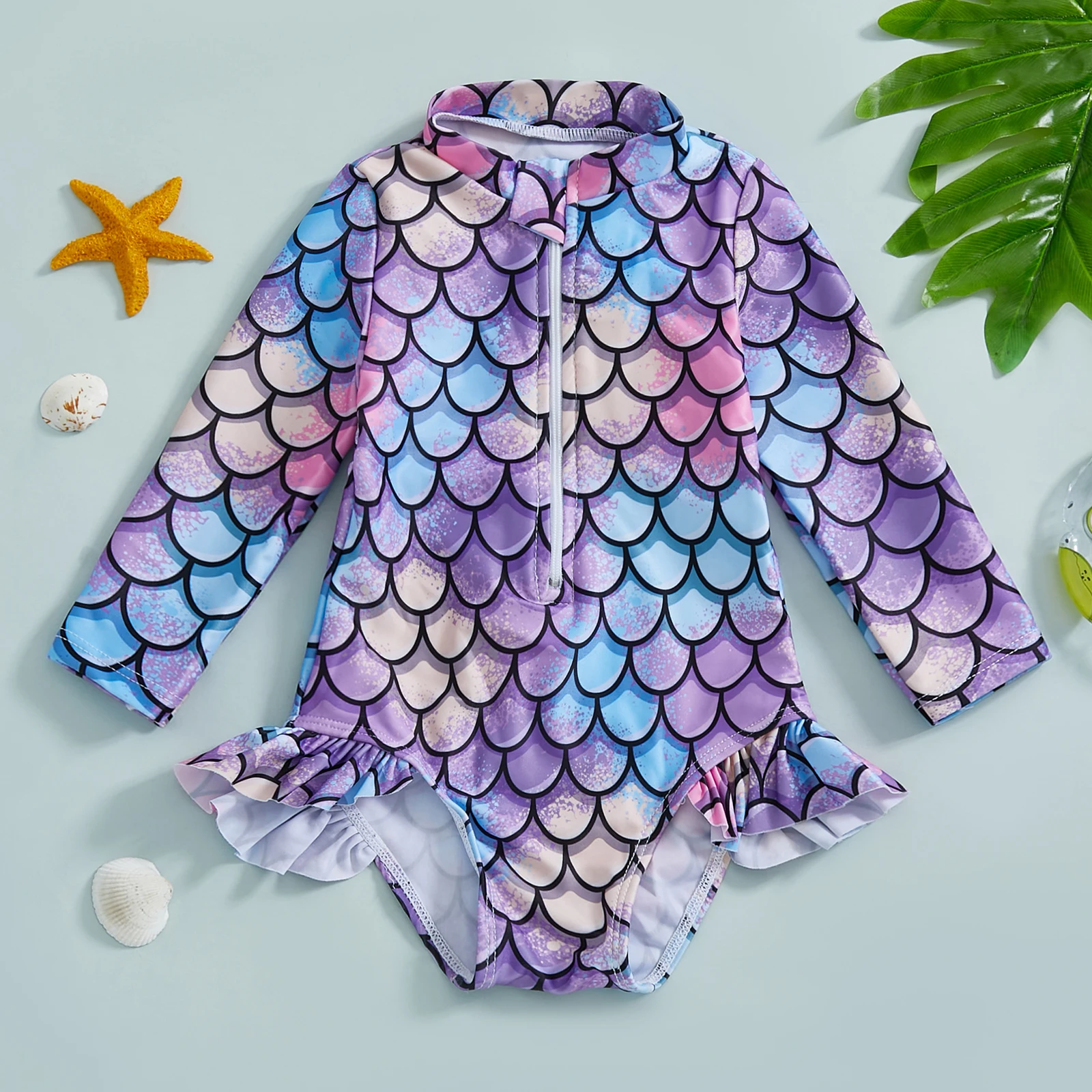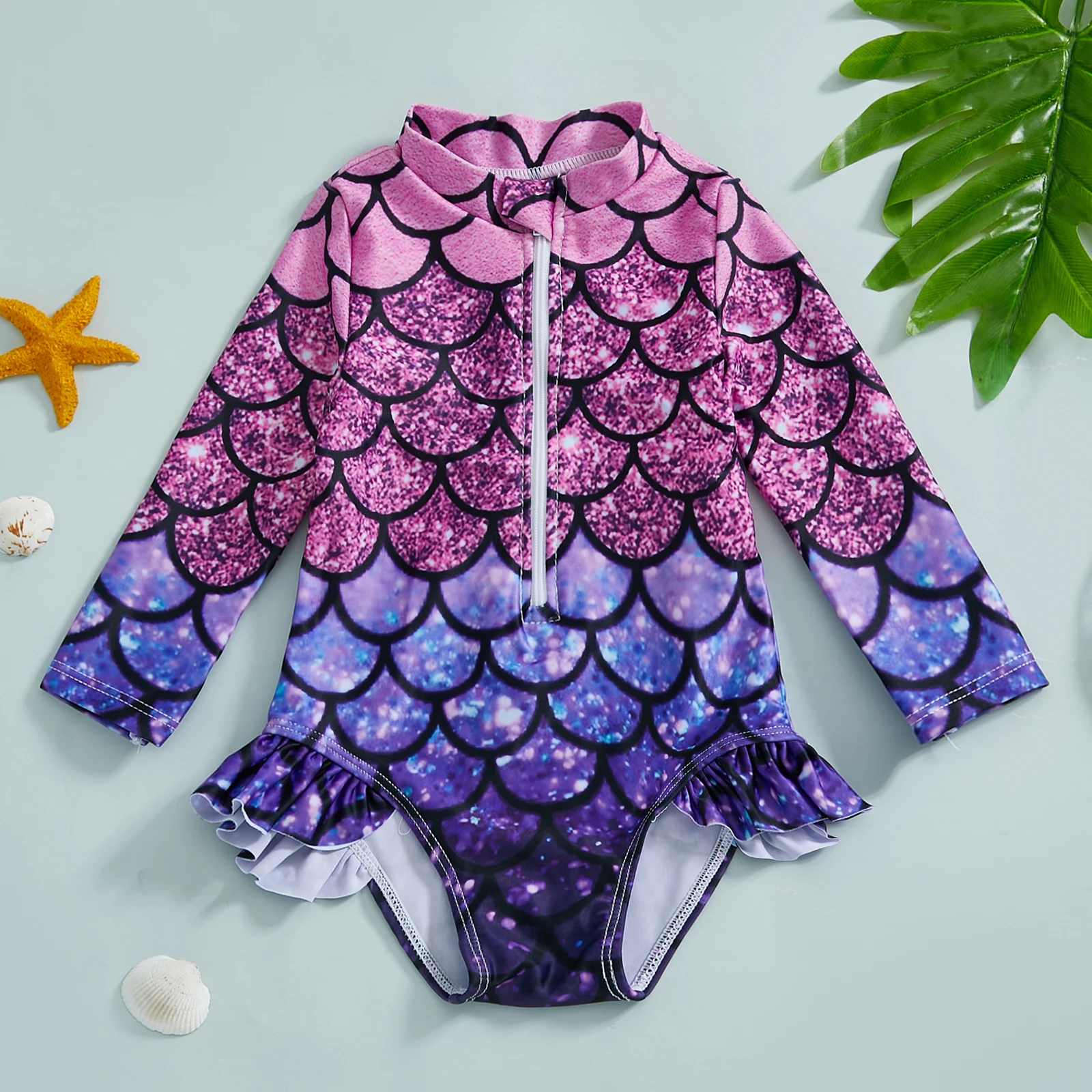 Princess Baby Girls Bikini Beachwear Summer Rash Guard Toddler Swimsuit Fish Scale Print Zipper Long Sleeve Ruffled Kid Swimwear