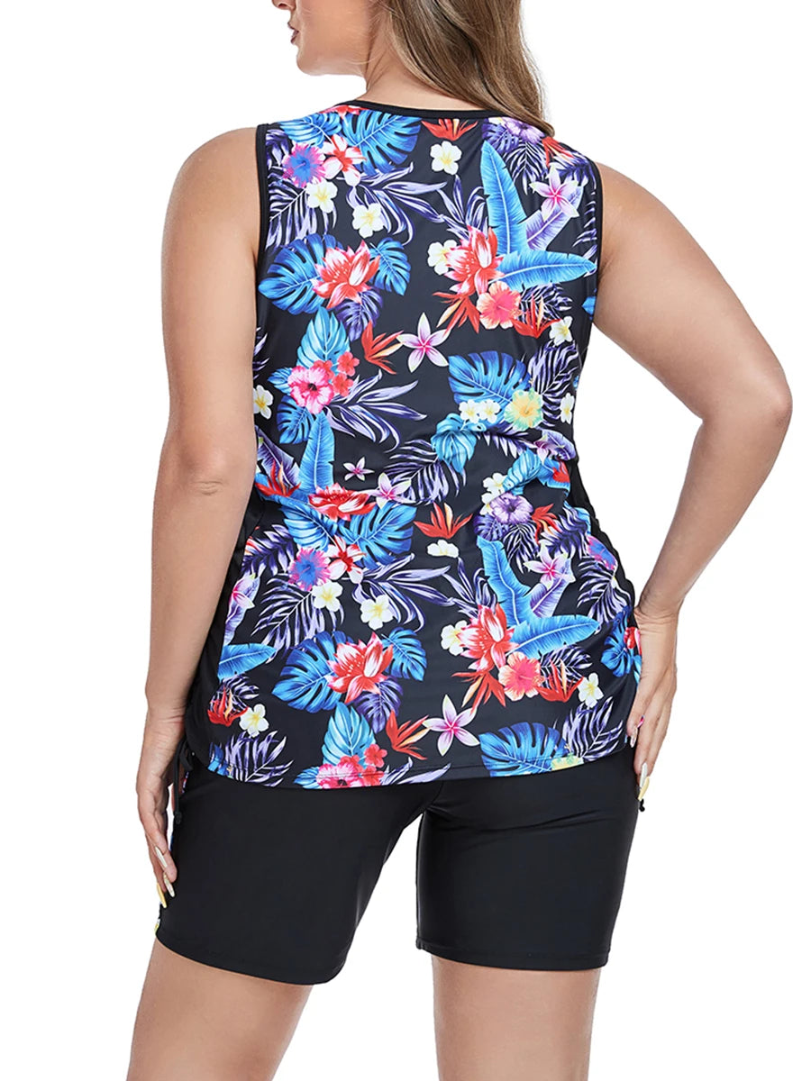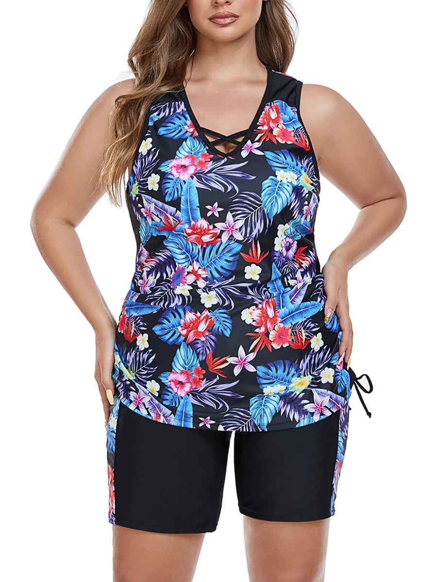 This plus size two-piece tankini swimsuit offers comfortable coverage with a stylish high waist design, ideal for swimming and beachwear. Made for confident movement, the vibrant print enhances your look while providing support where needed. Perfect for women seeking both functionality and flattering fit in their swimwear.