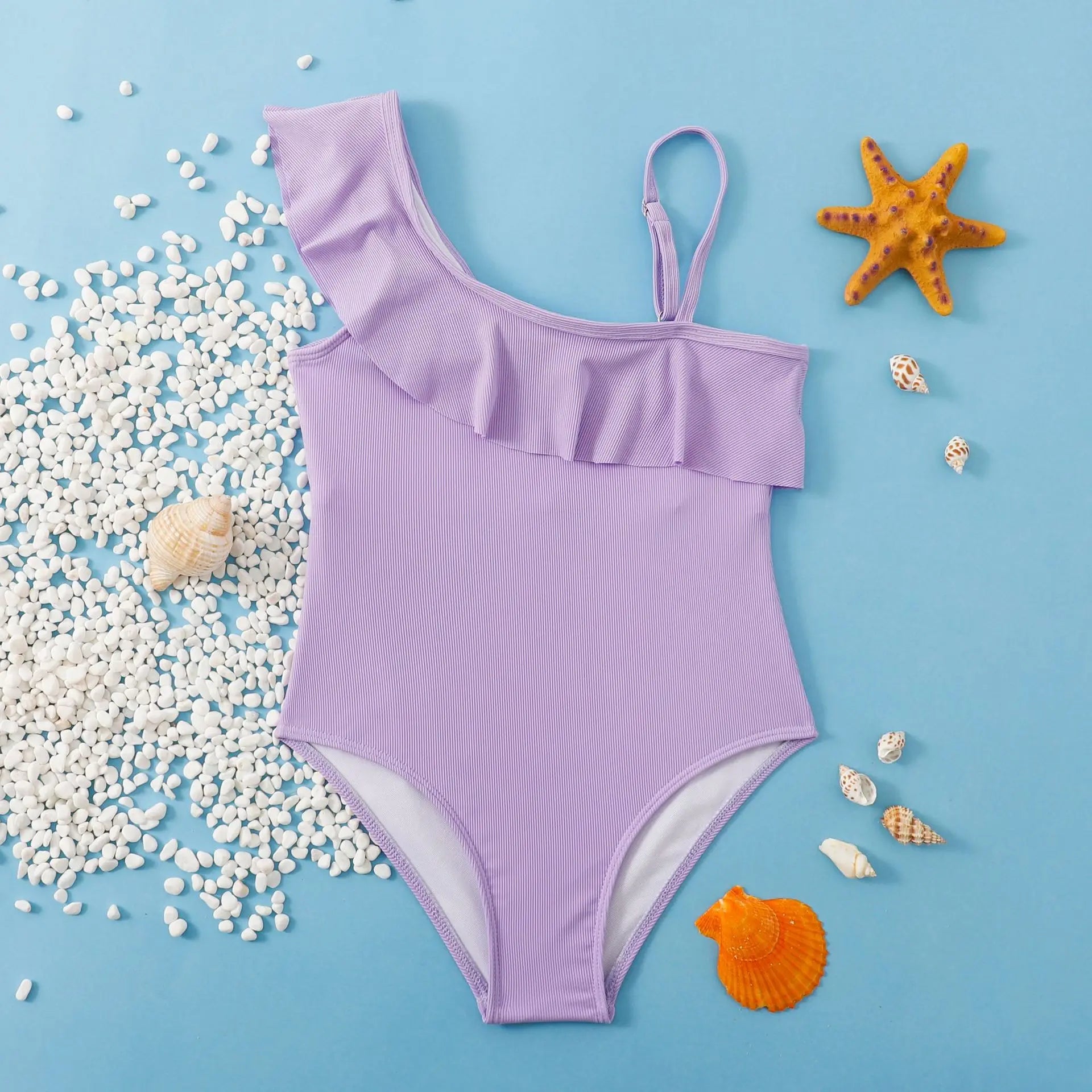 Purple Ruffle Girls One Piece Swimsuit 7-12 Year Kids Swim Suit Bodysuit Children's Swimwear Bathing Suits Beach