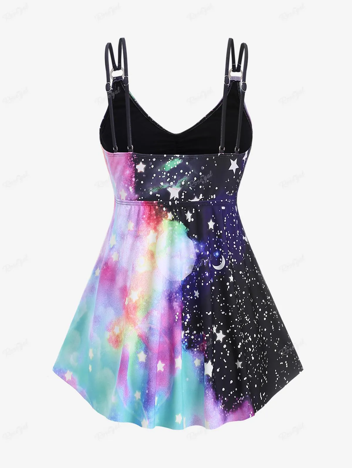 Embrace celestial style with this plus-size tankini swimsuit, designed for confident comfort and flattering coverage. The ruched detailing at the sides creates a slimming silhouette while the galaxy moon and stars print adds a captivating visual element. The boyleg cut offers extended leg coverage and support, while the tankini top provides excellent bust support without sacrificing style. Perfect for pool days, beach outings, or water activities, this swimsuit combines functionality with eye-catching design. Crafted for durability and chlorine resistance, it's an ideal choice for swimmers seeking both aesthetic appeal and practical performance in a plus-size fit.