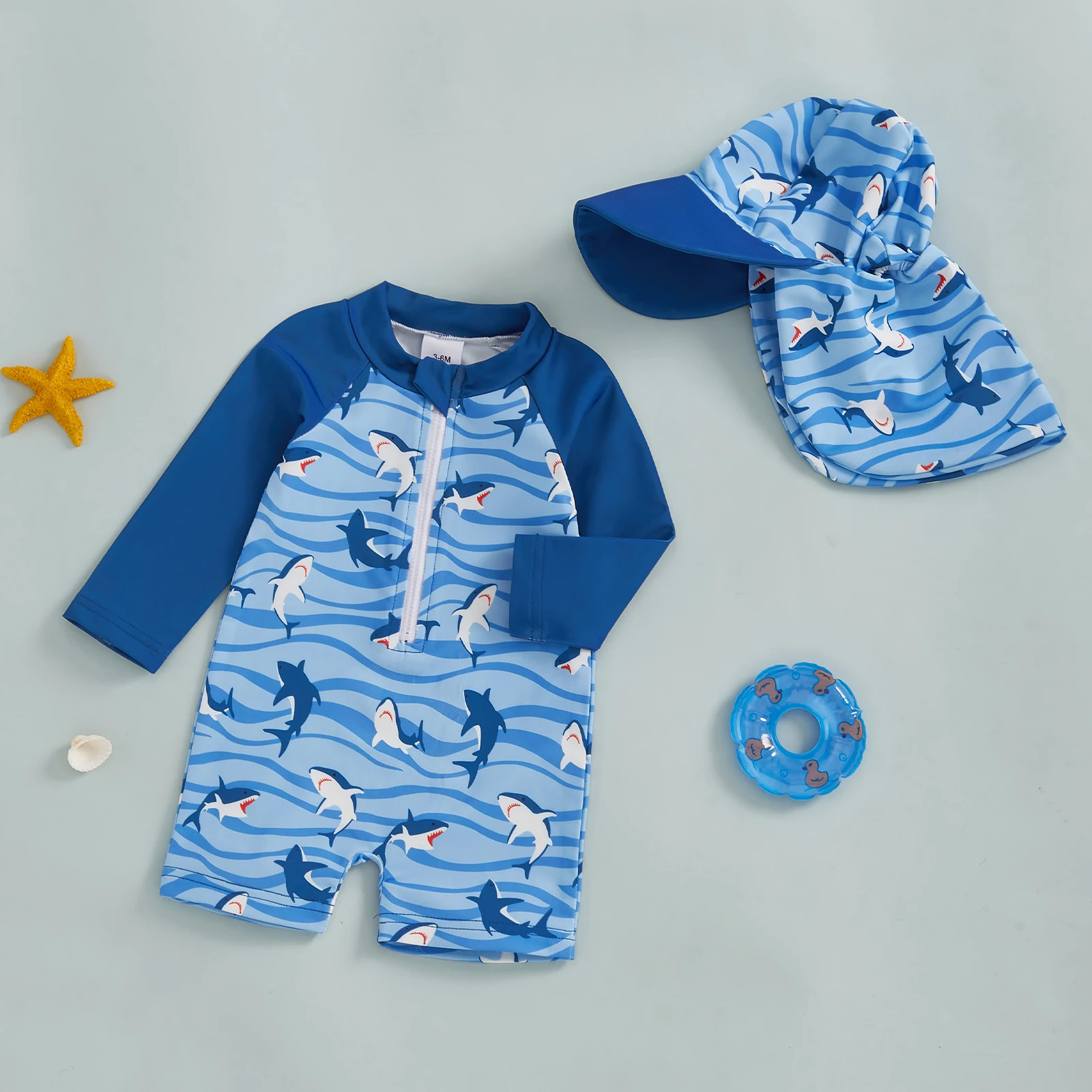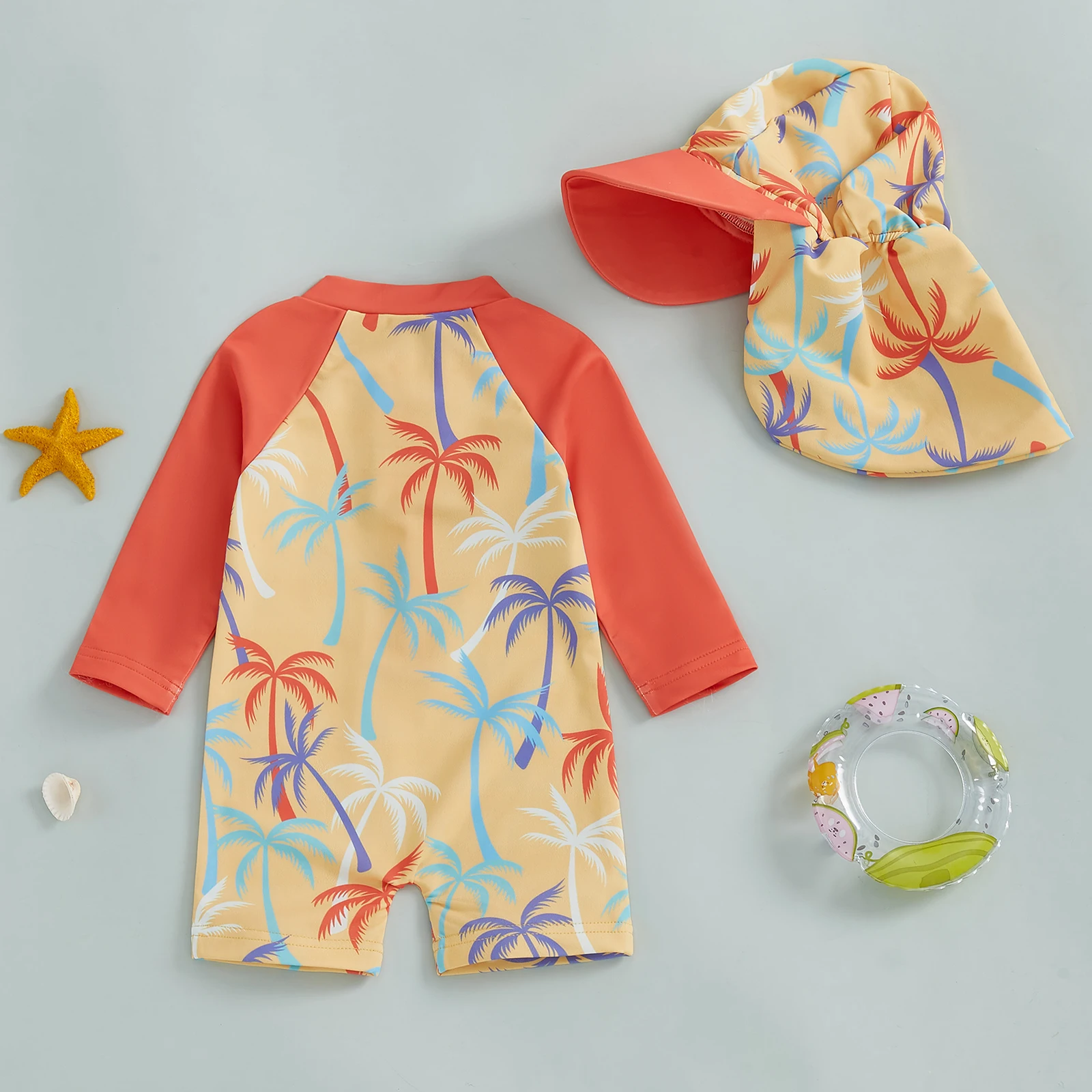 Toddler Baby Boys Long Sleeve Swimwear Rash Guard with Swim Cap Summer Coconut Tree Print Swimsuit Bathing Suit Zip Beachwear