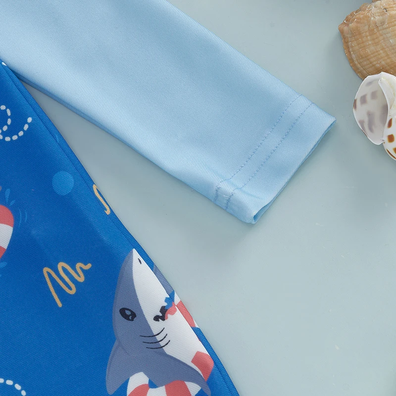 Keep your little one protected and stylish at the beach with this comprehensive swim set. Featuring a long-sleeve rash guard with engaging shark print design, the half-zipper construction makes dressing effortless for active toddlers. The non-pilling fabric maintains its quality through repeated wear and washing, while UPF sun protection shields delicate skin from harmful rays. The included matching sunhat provides additional head and face coverage during extended water play. Perfect for pool days, beach outings, or water sports activities, this set combines practical sun safety with fun, age-appropriate styling that toddlers love.