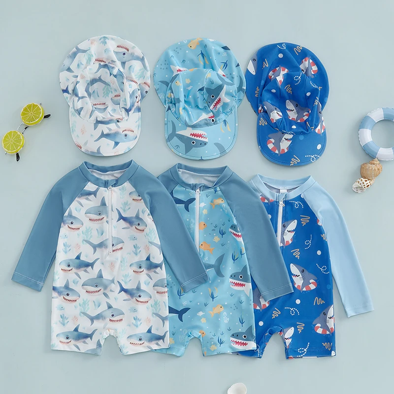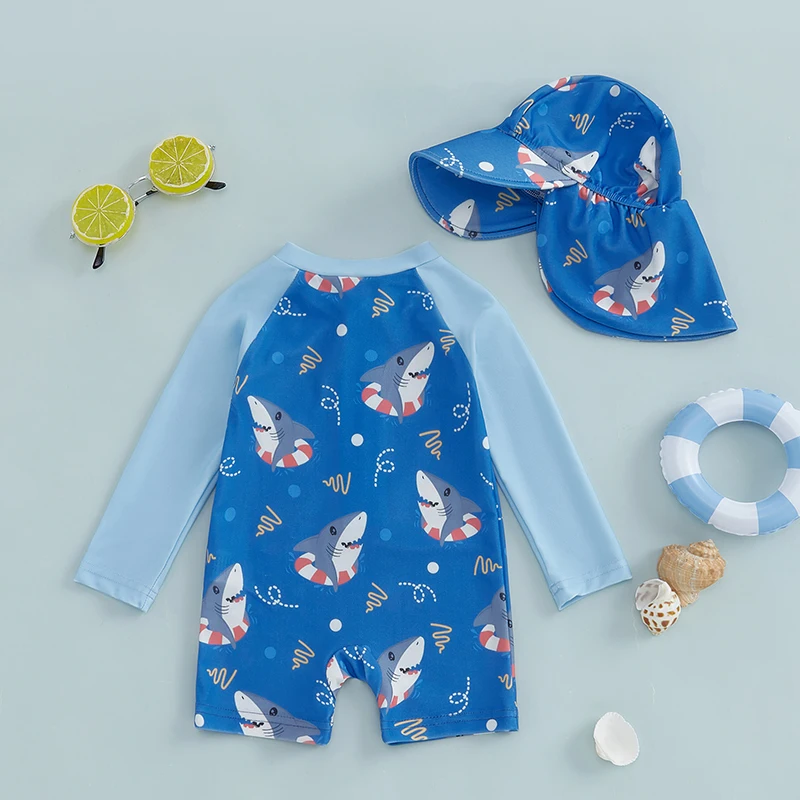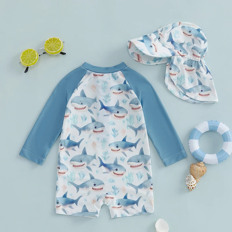 Toddler Boy Long Sleeve Swimsuit Shark Print Half Zipper Non-Pilling Rash Guard Swimwear Sunhat Set