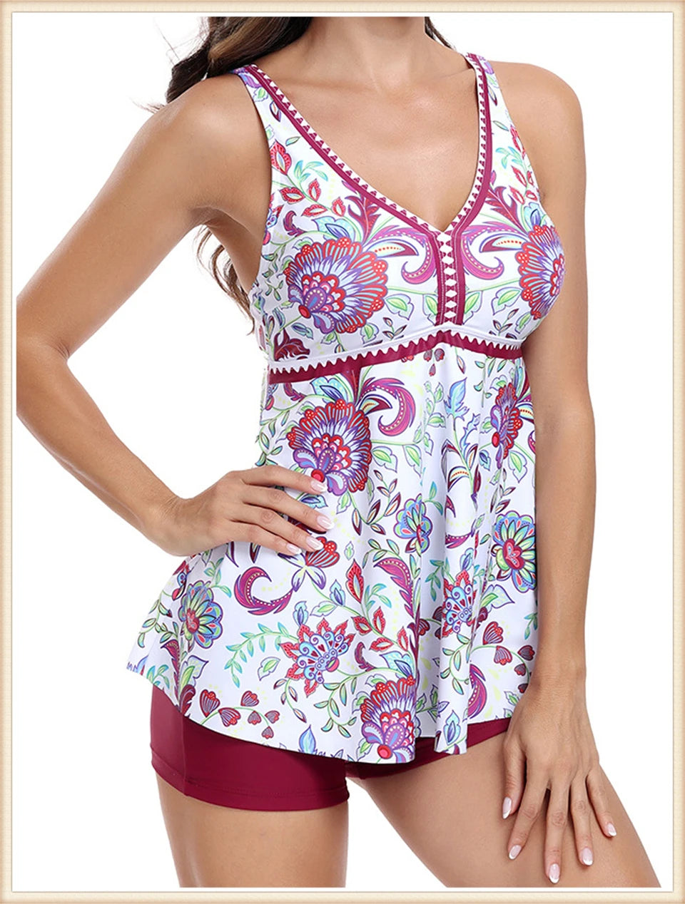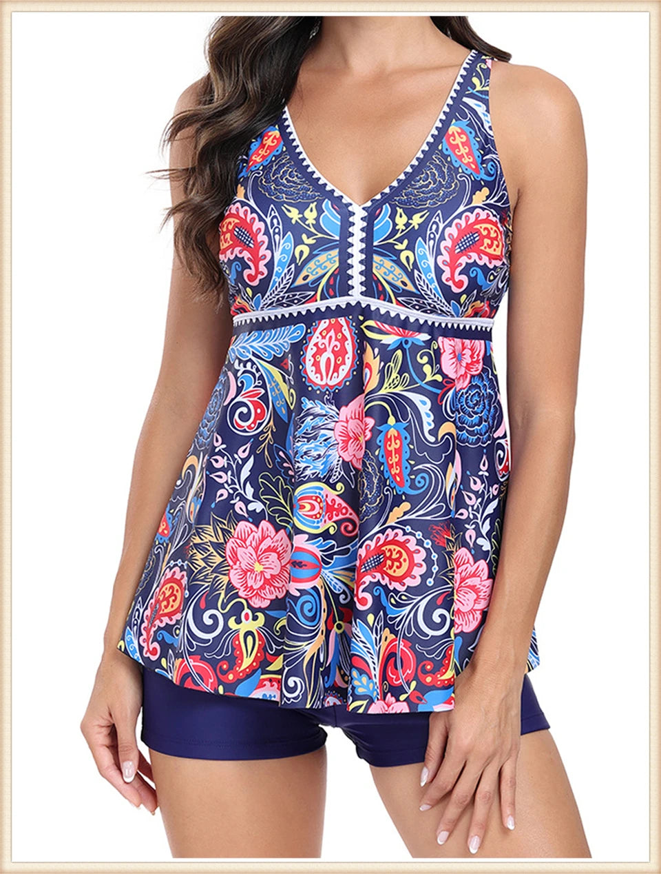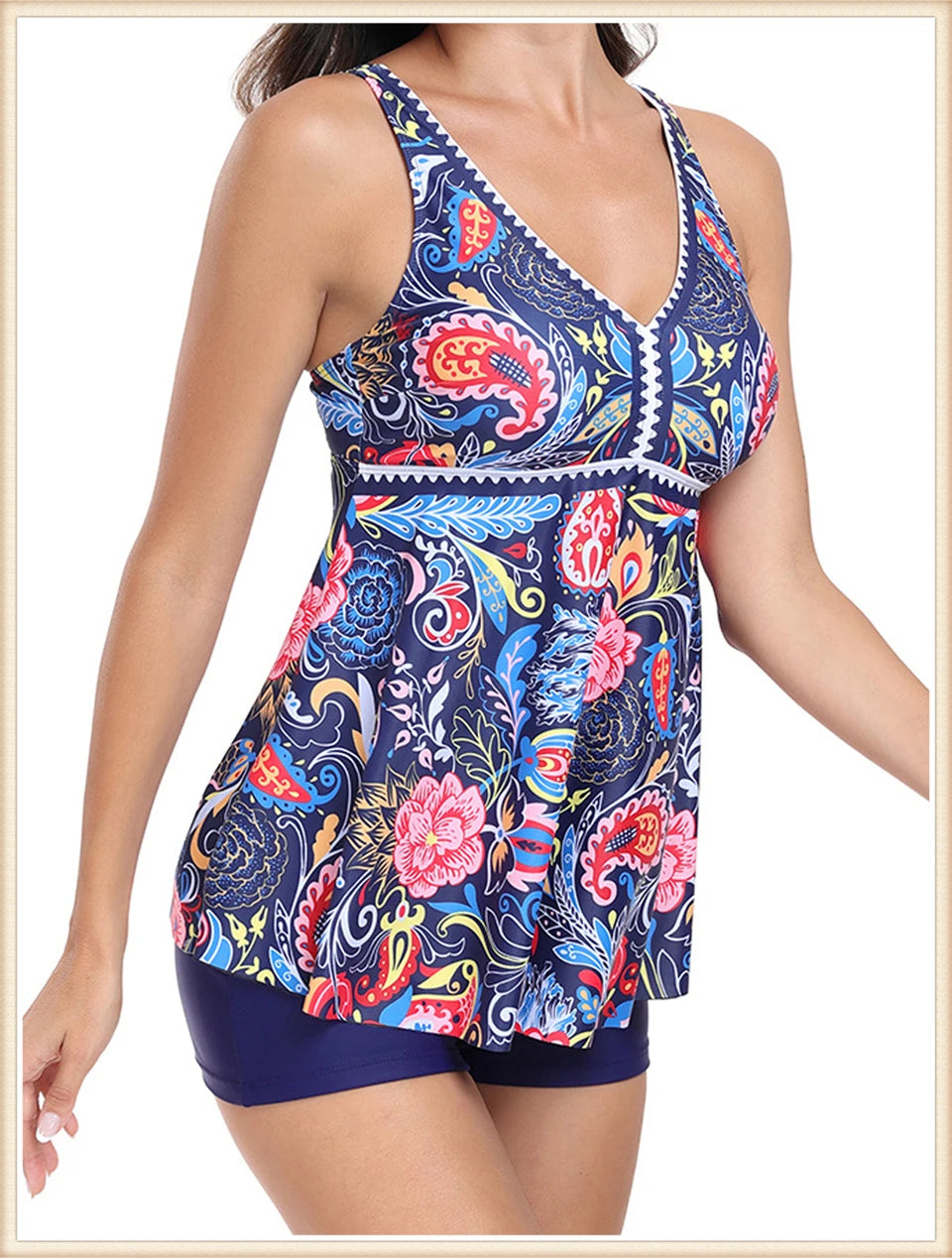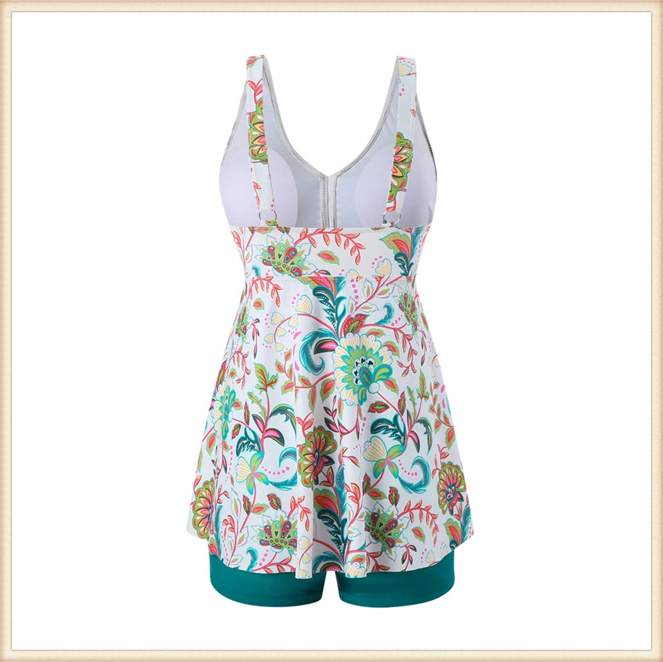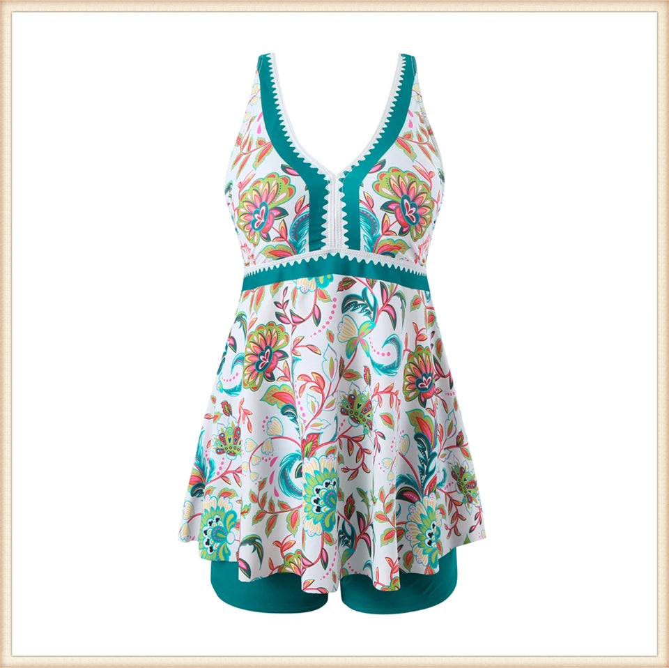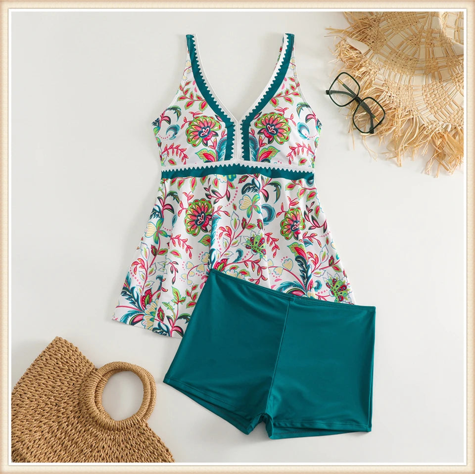 This two-piece women's swimsuit features a flattering V-neck tankini top with a stylish print, paired with high-waisted bottoms for enhanced comfort and coverage. Designed for both beachwear and swimming, this set combines fashion and function, providing support and confidence during summer activities. Its high waist design helps shape and smooth, making it ideal for a variety of body types. Perfect for those seeking a versatile and elegant swimwear option.