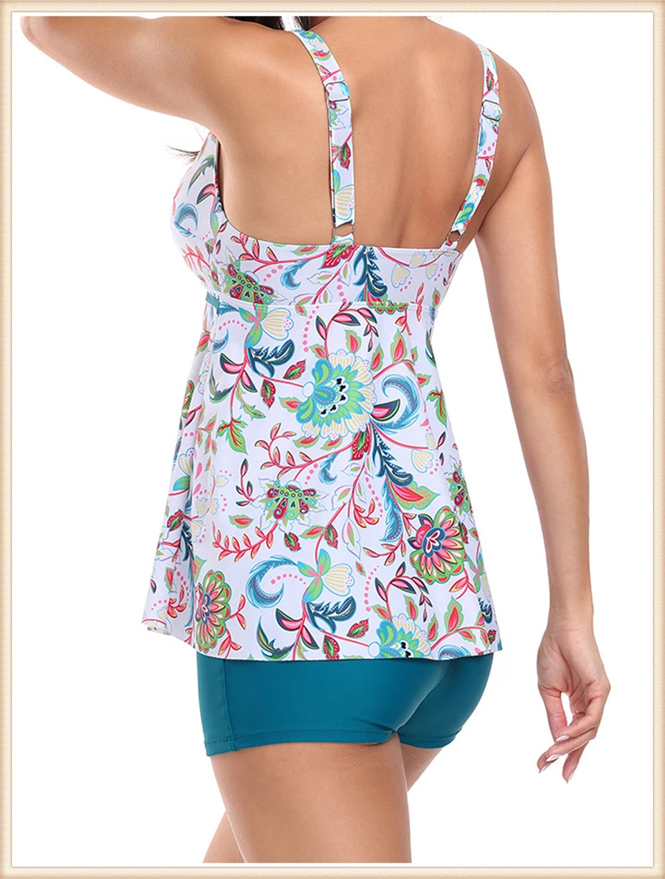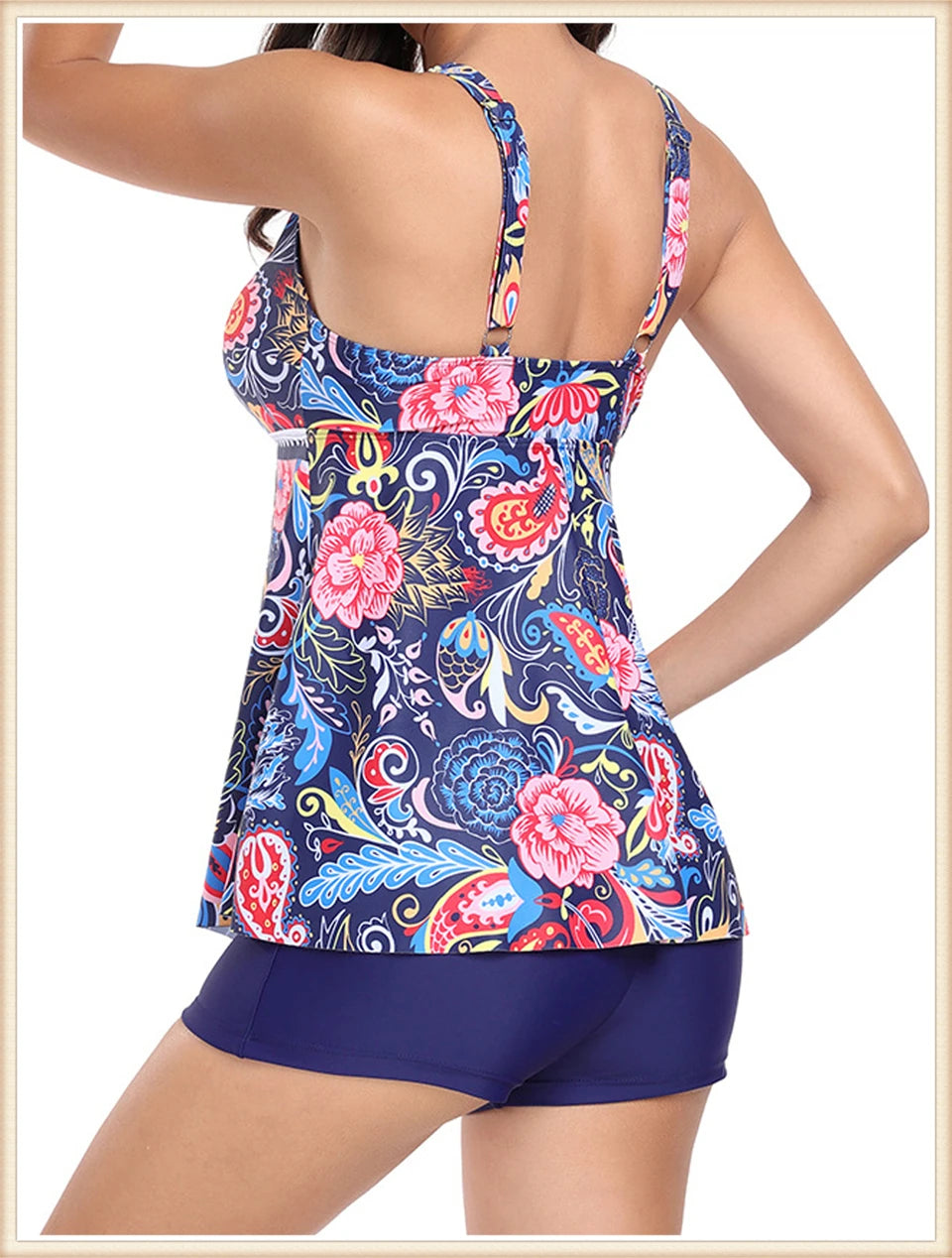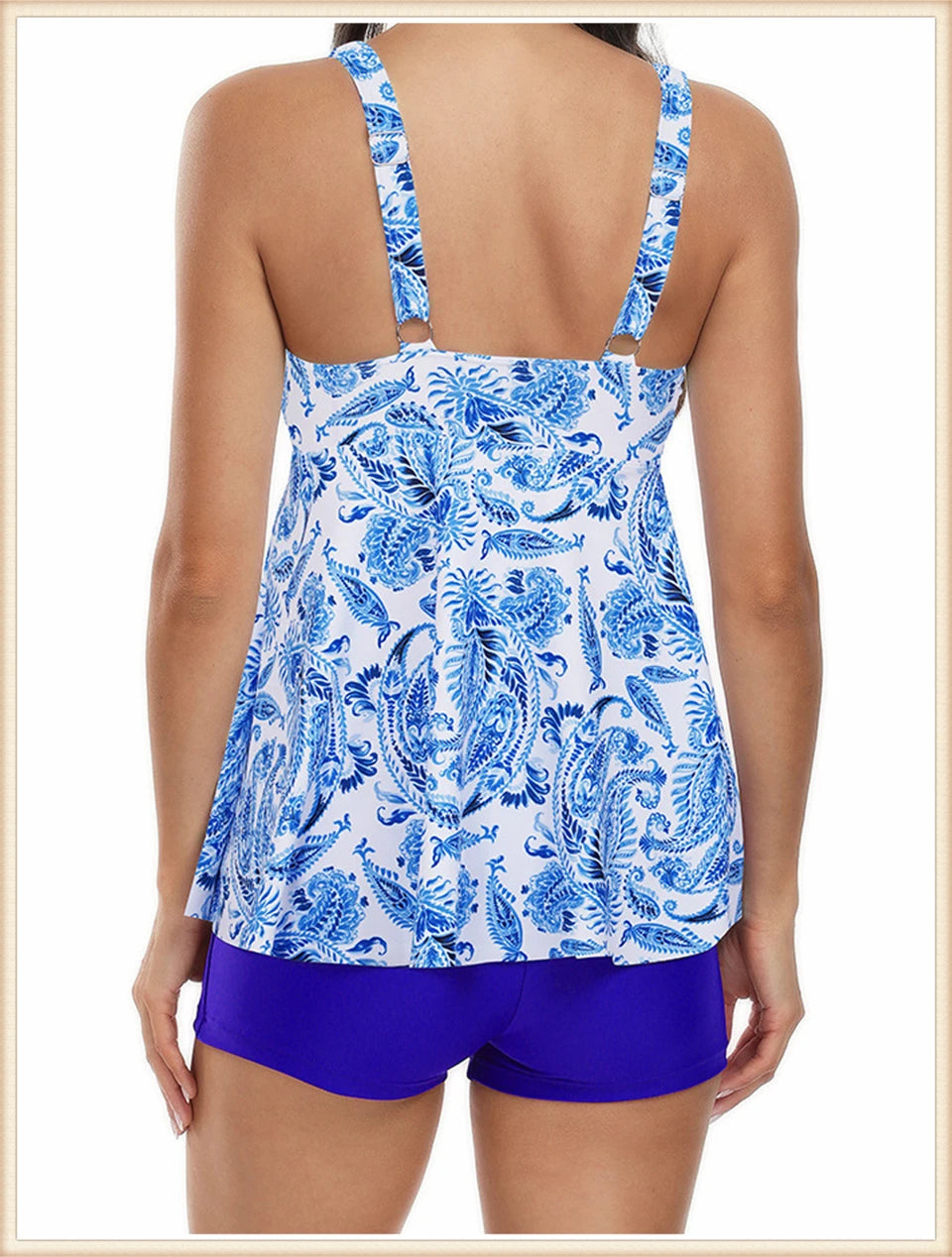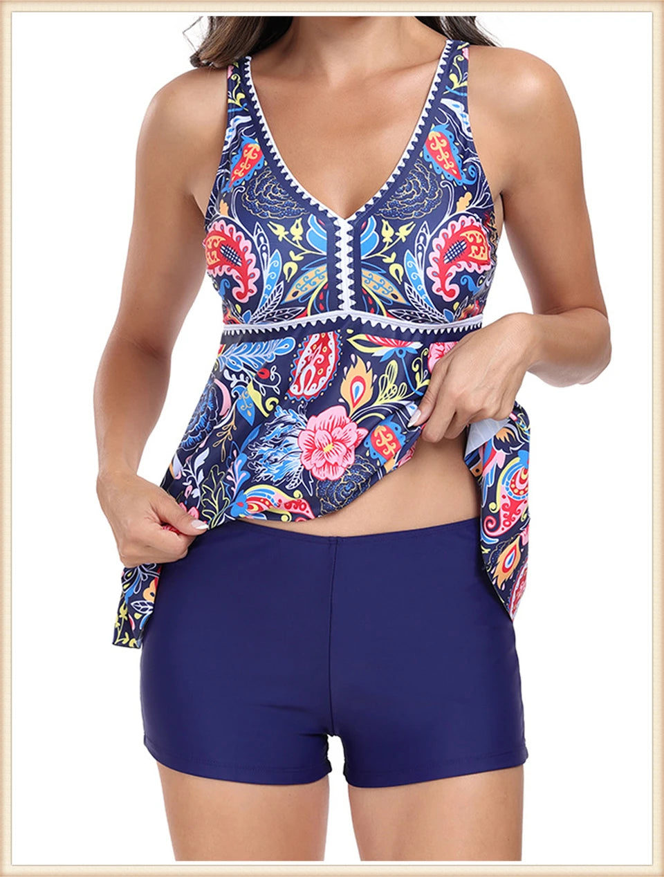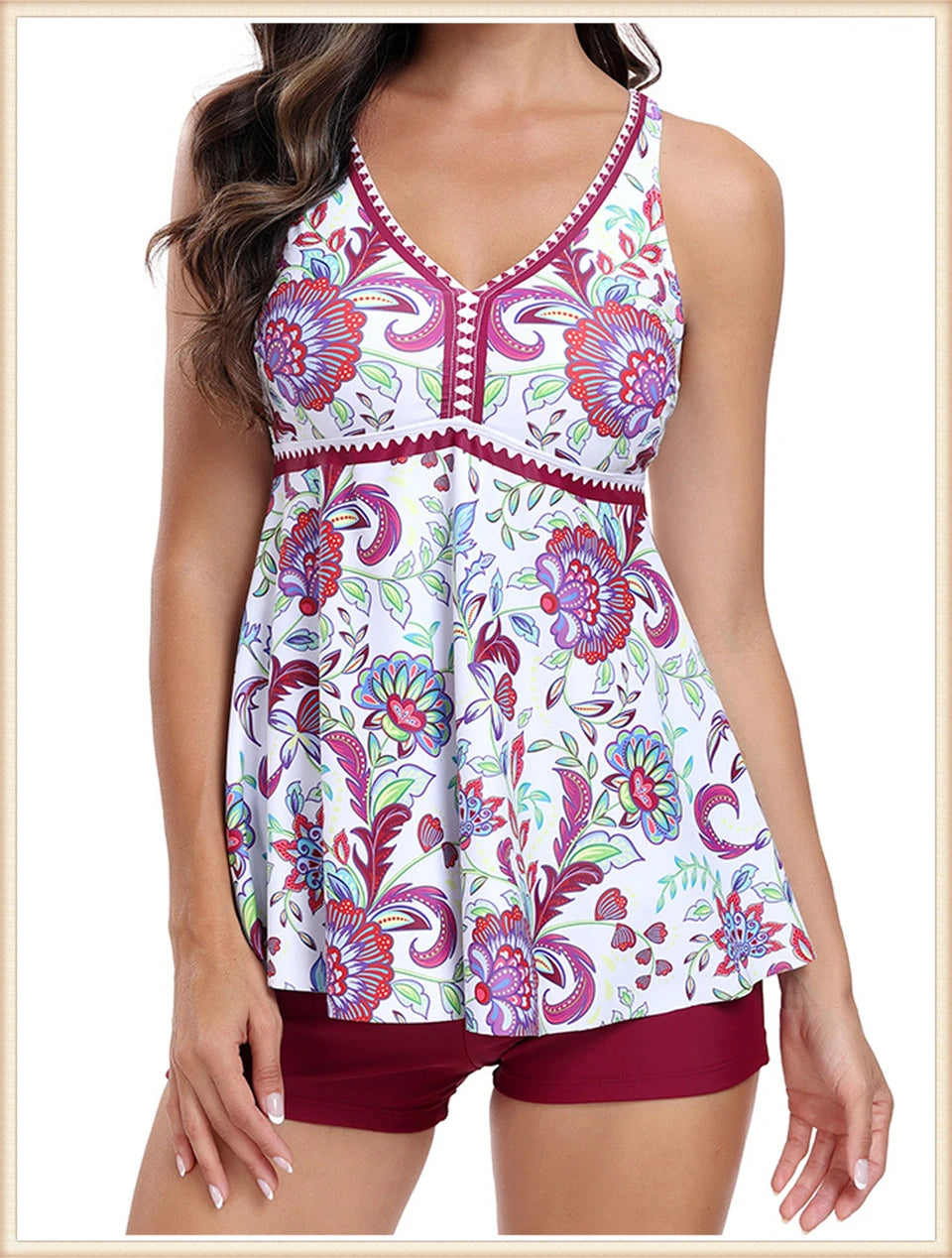 This two-piece women's swimsuit features a flattering V-neck tankini top with a stylish print, paired with high-waisted bottoms for enhanced comfort and coverage. Designed for both beachwear and swimming, this set combines fashion and function, providing support and confidence during summer activities. Its high waist design helps shape and smooth, making it ideal for a variety of body types. Perfect for those seeking a versatile and elegant swimwear option.