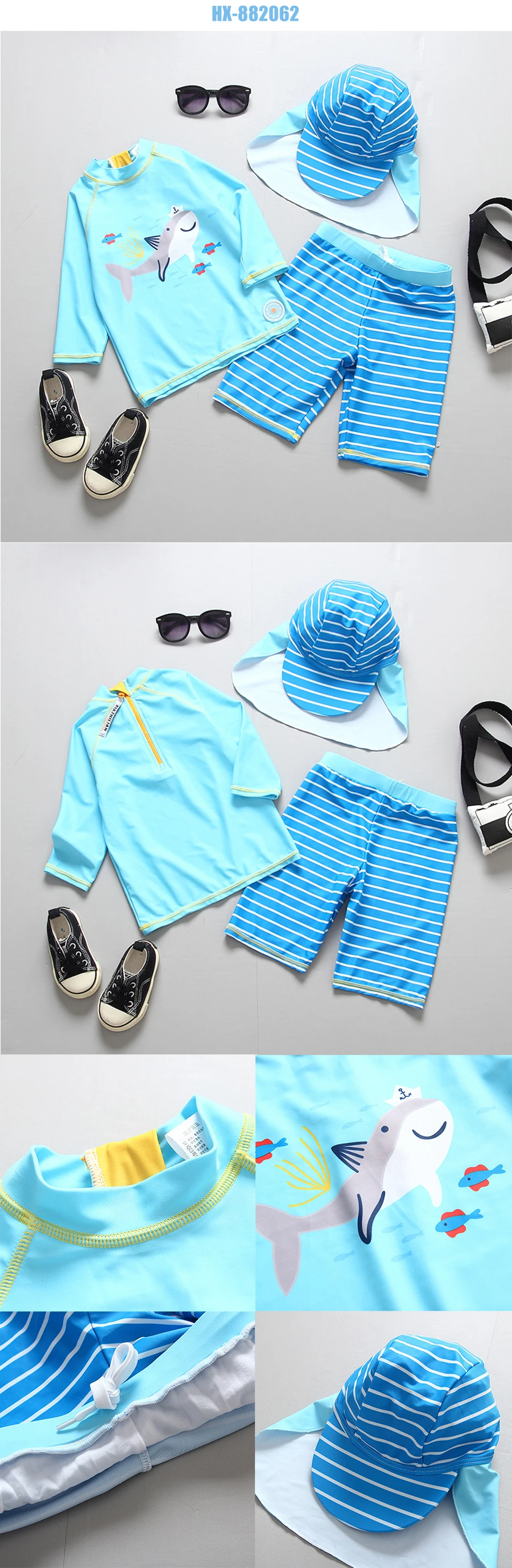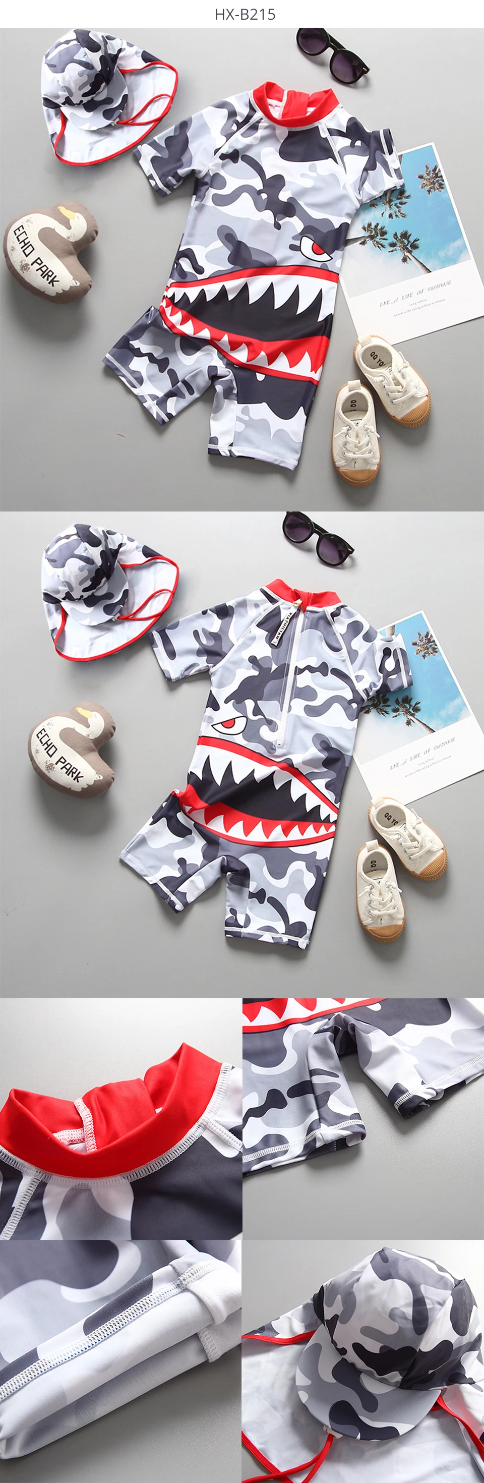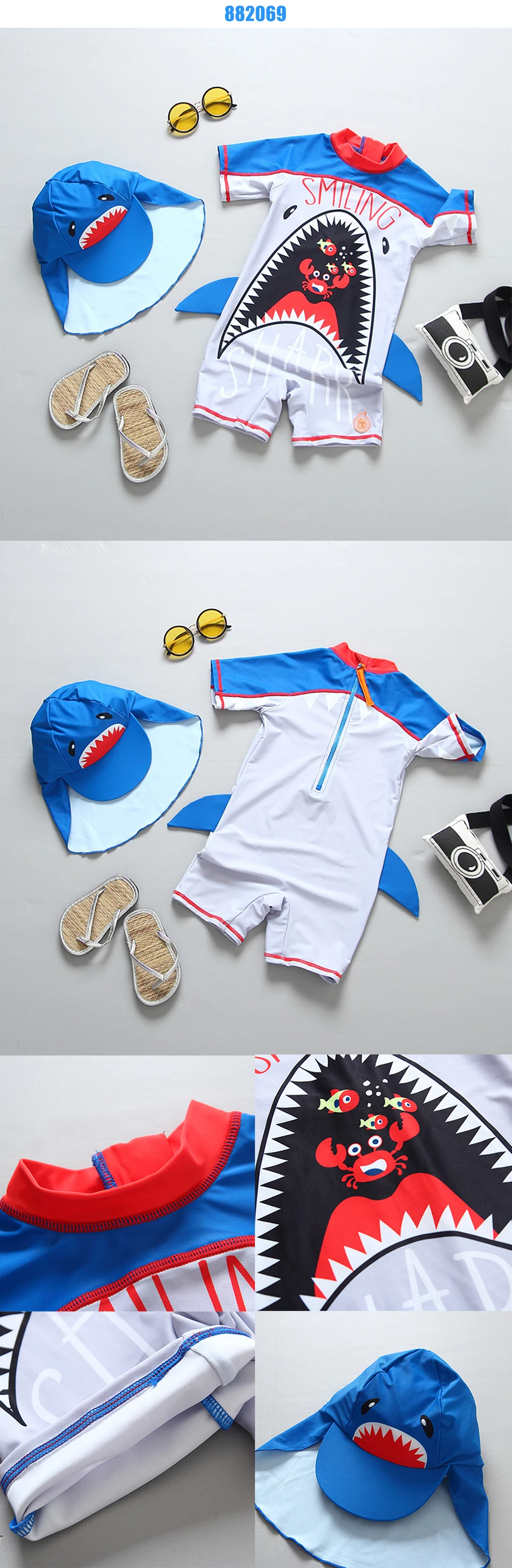 With UPF 50+ sun protection with cartoon dinosaur & shark print, this rashguard set keeps him cute and protected all day long.