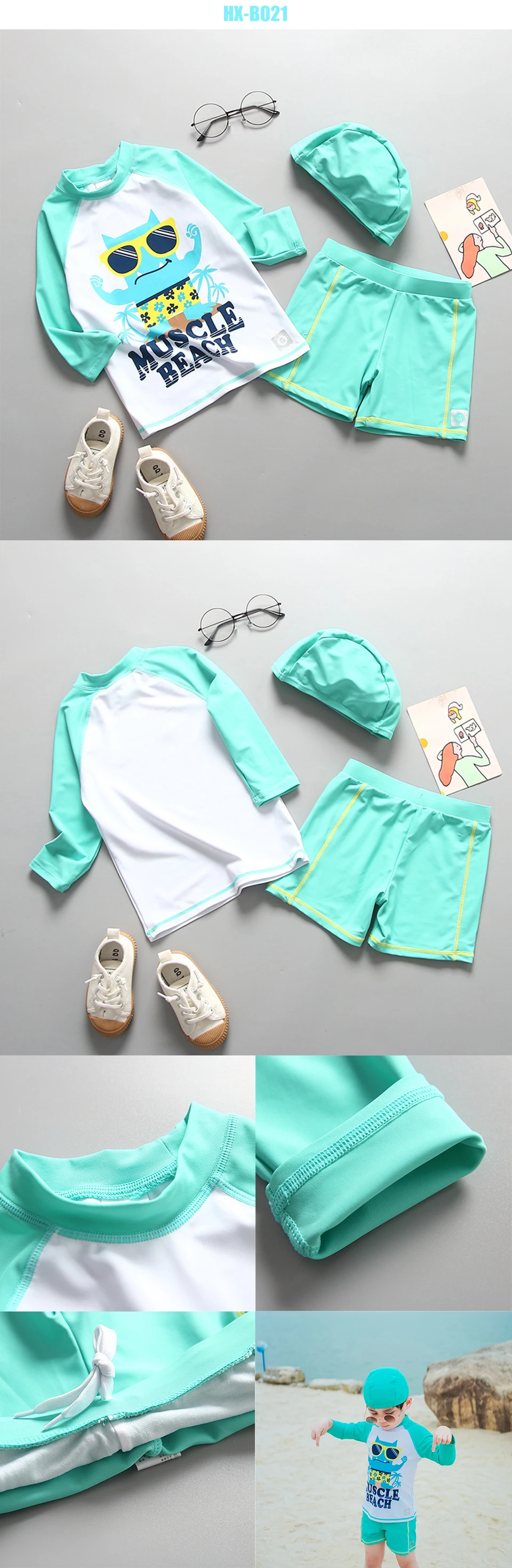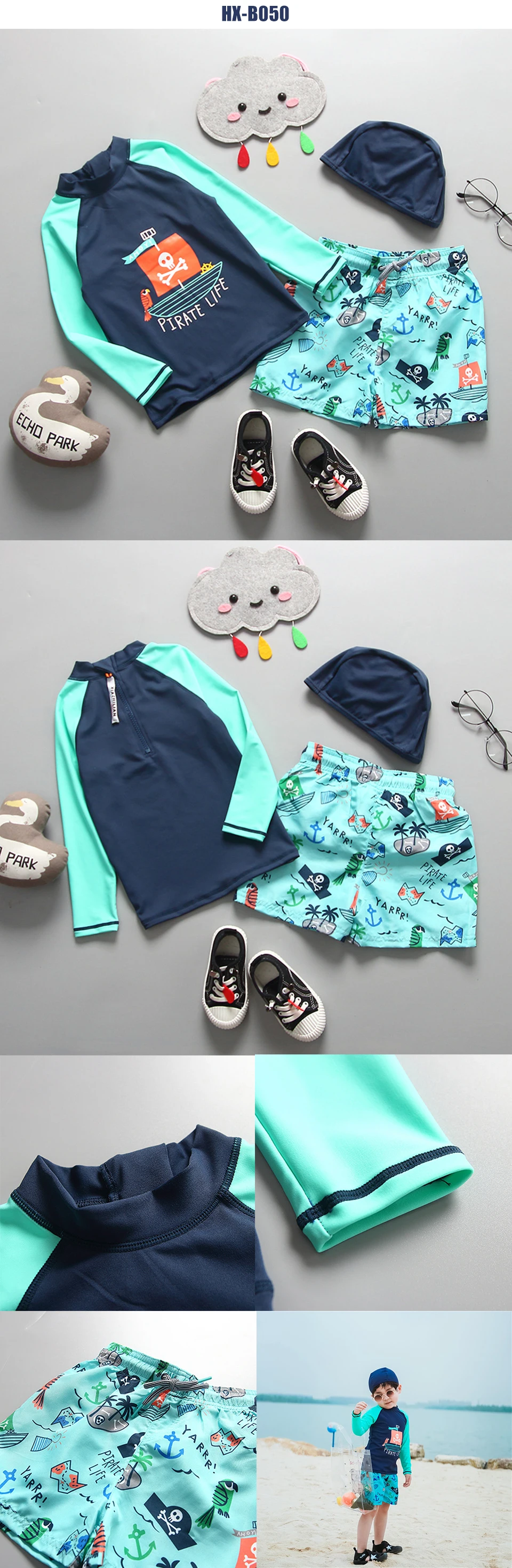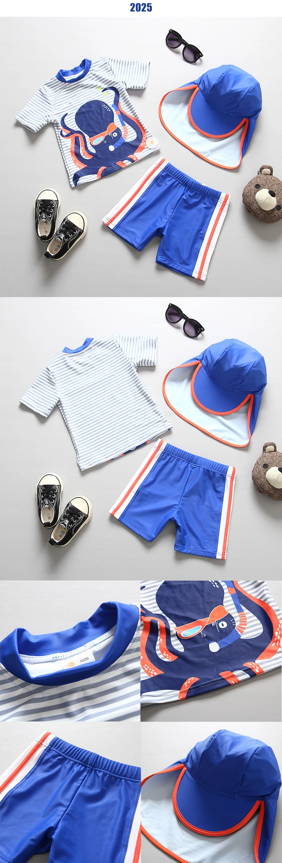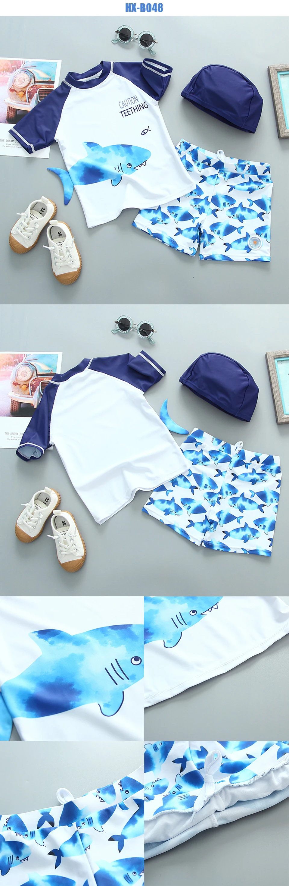 With UPF 50+ sun protection with cartoon dinosaur & shark print, this rashguard set keeps him cute and protected all day long.