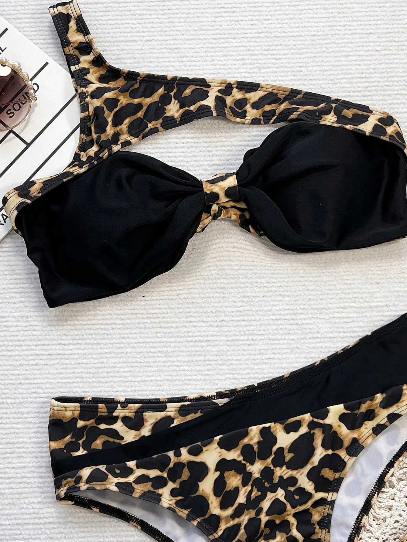 Leopard Print Patchwork Swimwear Women Hollow Bikini Set Push Up Lady Swimsuit Beach Brazilian Bathing Suit