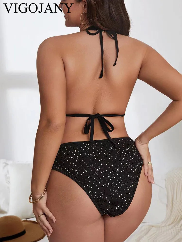 Make a confident statement in the water with this striking three-piece bikini set designed for curves. The tied halter neckline and push-up construction deliver flattering support and lift, while the sheer mesh overlay adds contemporary edge. The backless design creates a bold silhouette, and the high-waisted bottoms provide comfortable coverage. Crafted for plus-size figures, this set combines modern styling with practical swimwear engineering for a look that's both daring and wearable.