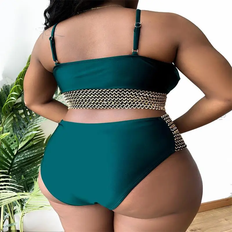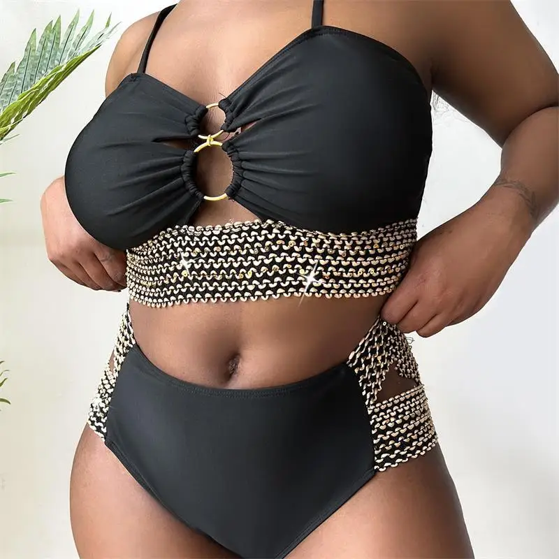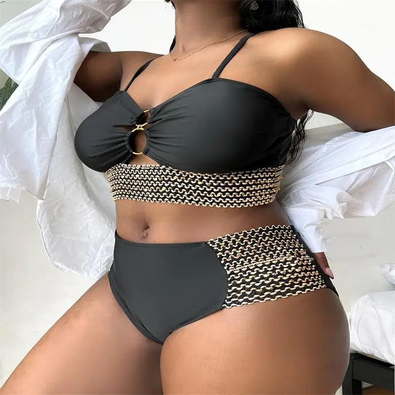Patchwork Hollow Two Piece Plus Size Bikini Women Strapped High Waist Swimsuit Brazilian Beach Lady Bathing Suit