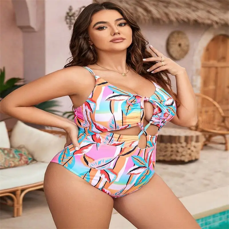 Make a statement at the beach with this striking tropical leaf print one-piece swimsuit, expertly designed for curvy figures. The cross-hollow detail at the front adds contemporary flair while the supportive straps ensure comfort and confidence. Crafted in quality fabric that moves with you, this Brazilian-style cut flatters your silhouette beautifully. Perfect for swimmers seeking both style and functionality in a plus-size fit that celebrates your curves.