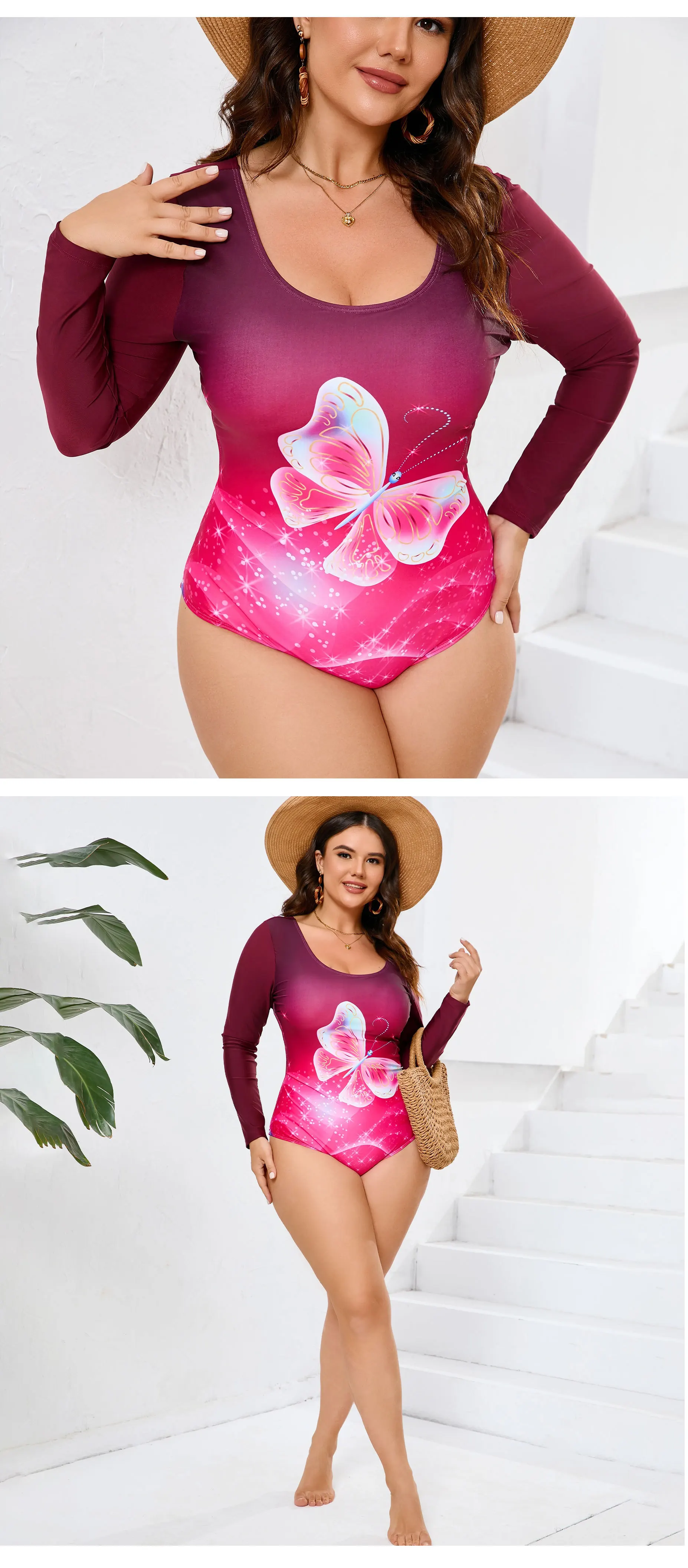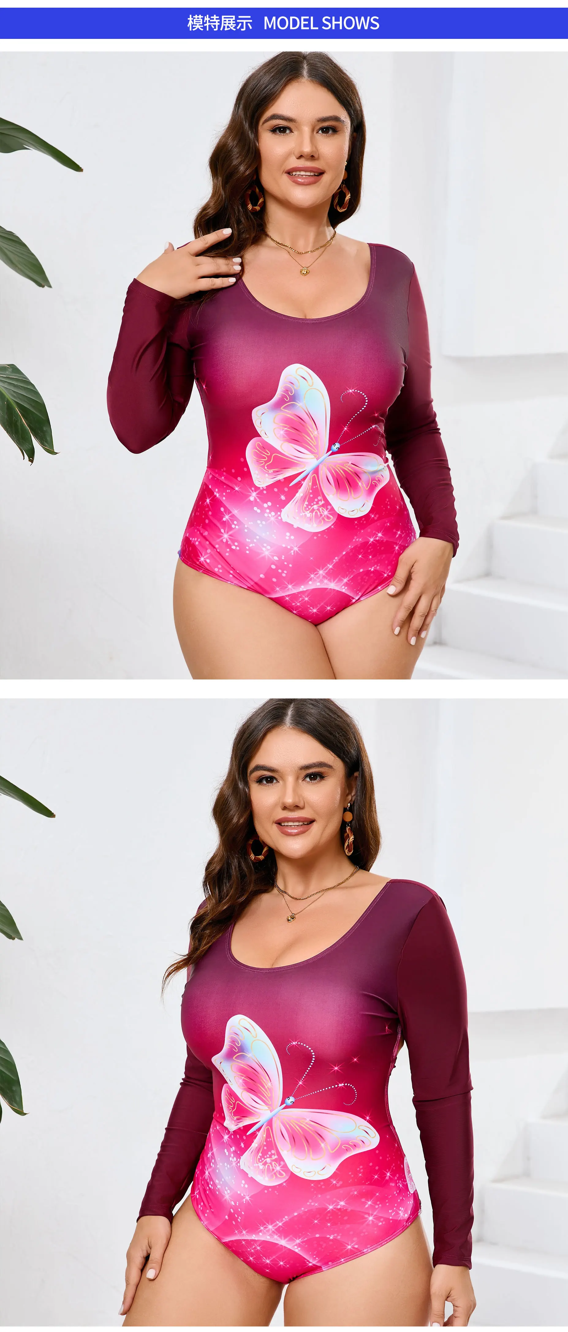 Red and Pink Butterfly Long Sleeve Plus Size Swimwear Women Backless Large Curvy One Piece Swimsuit Lady Big Bathing Suit