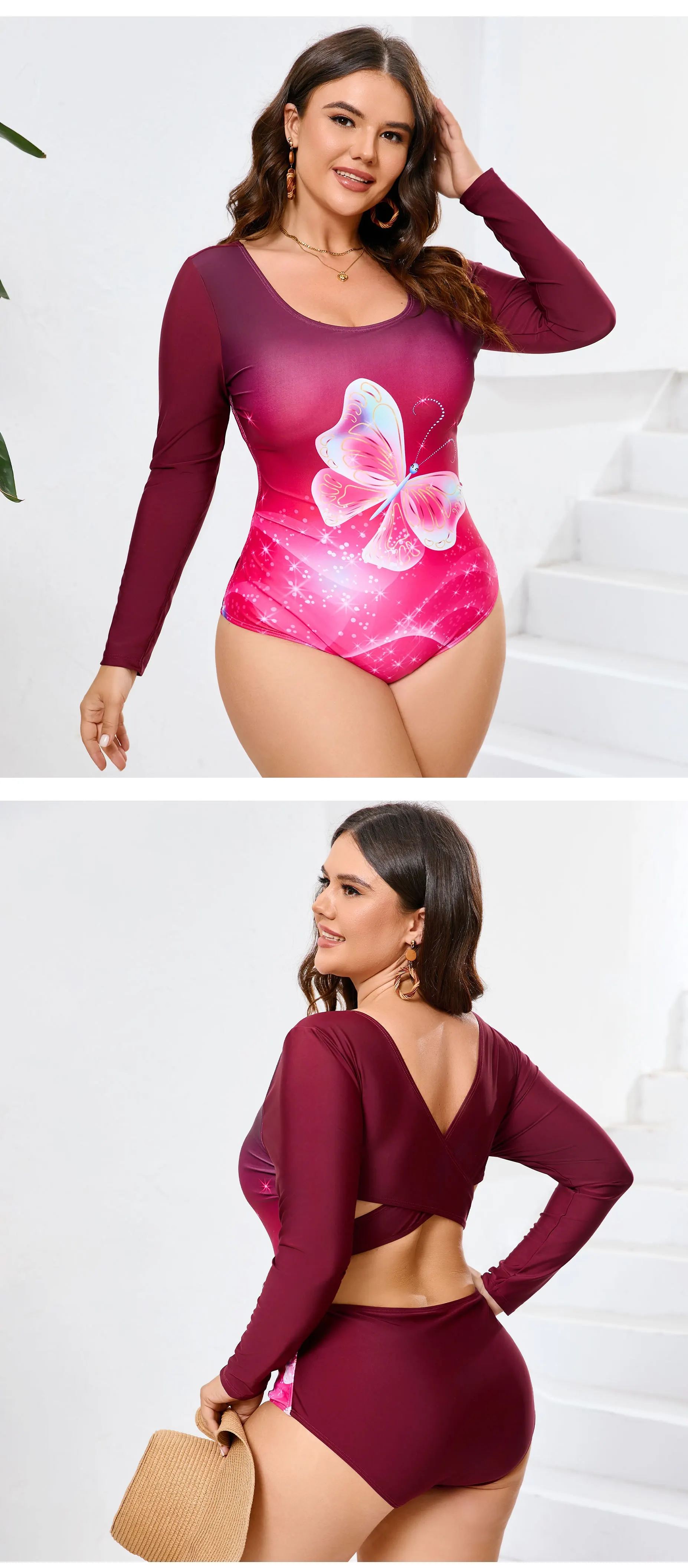 This plus-size one-piece swimsuit combines style and comfort with its vibrant red and pink butterfly design. Featuring long sleeves and a backless cut, it offers both sun protection and a flattering fit for curvy figures. Crafted to provide ample coverage while enhancing your silhouette, this large-size bathing suit is ideal for confident, stylish swimwear that supports and celebrates your shape.