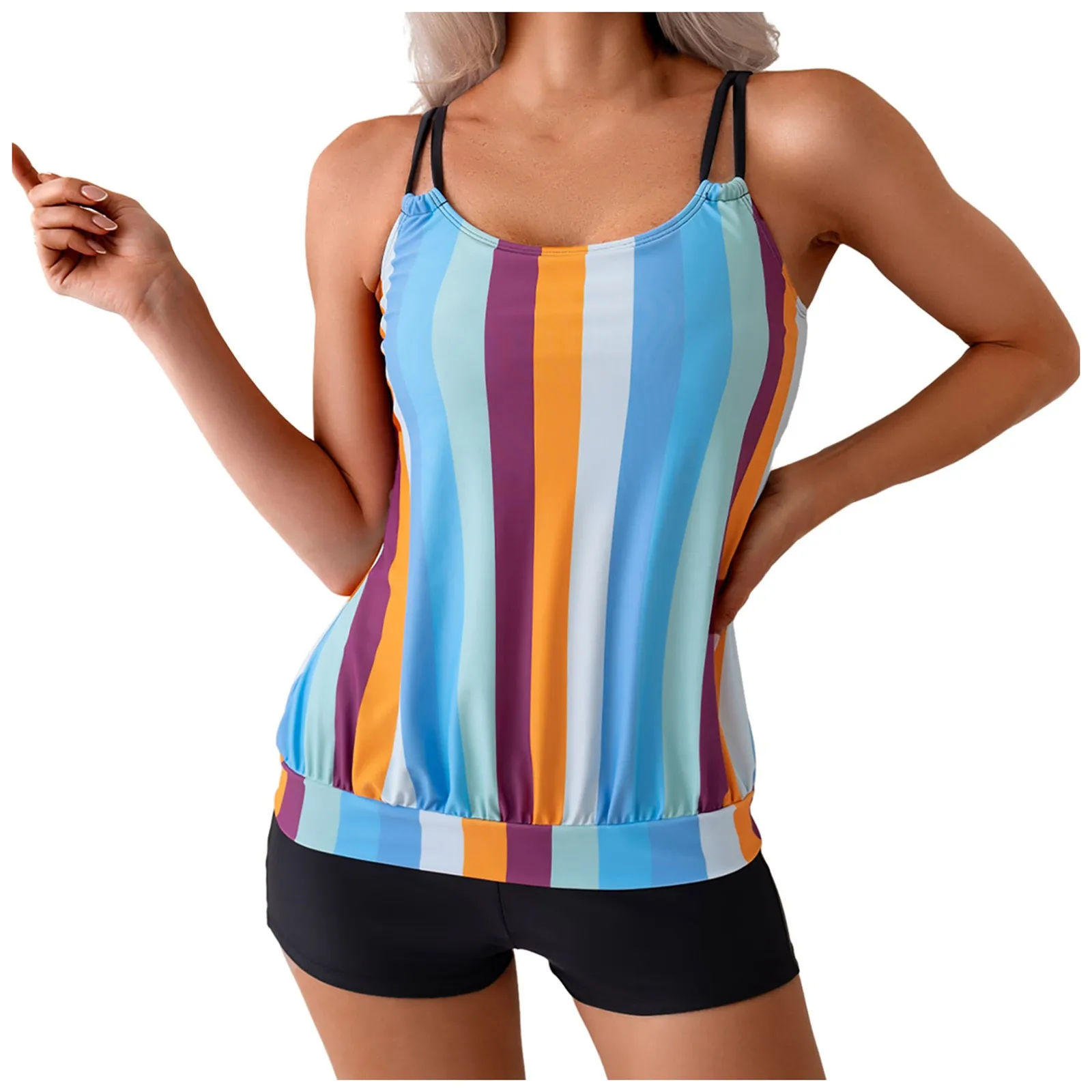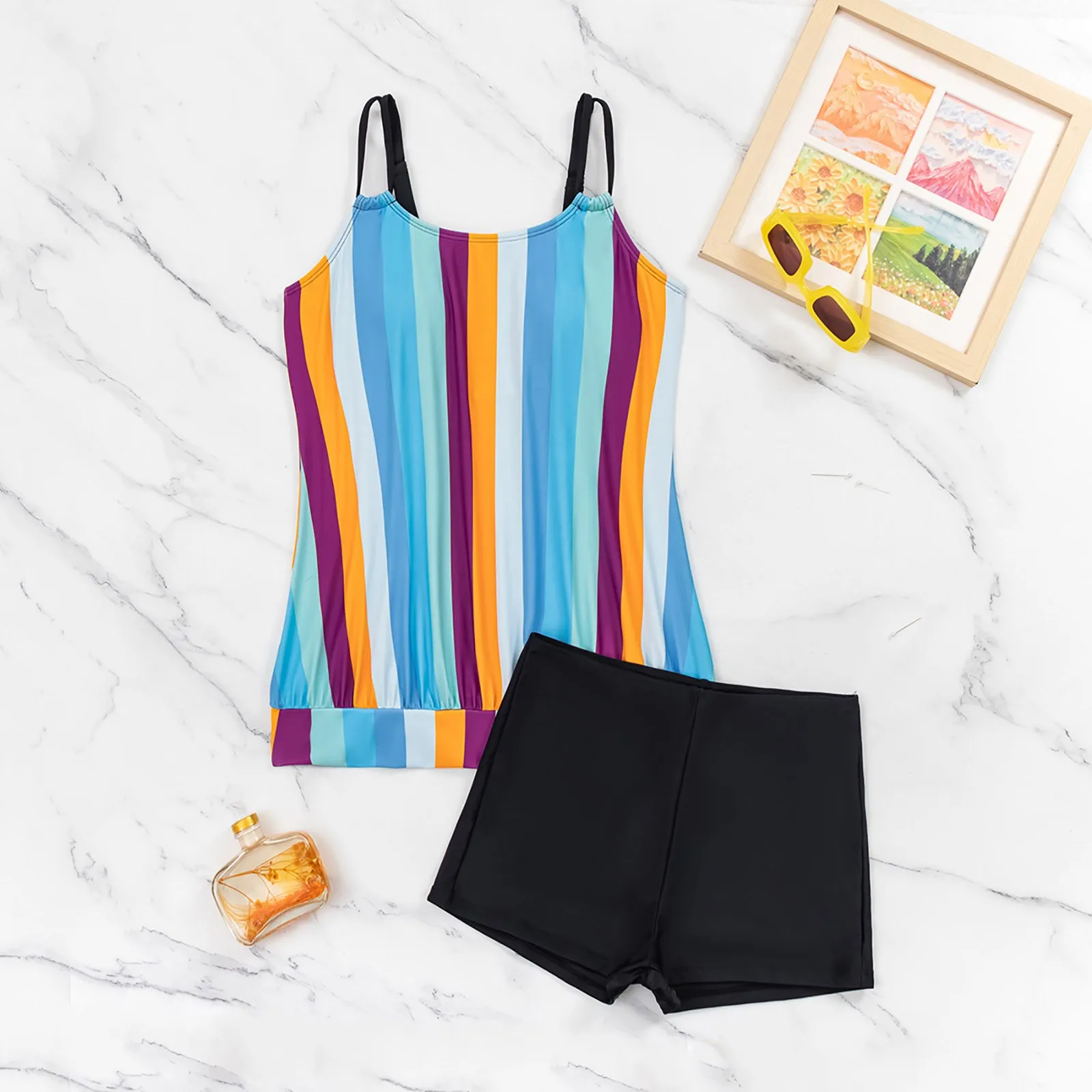 Women Colorful Vertical Swimwear Print Belly Covering Slimming Suspender Tankini Two Piece Conservative Swimsuit