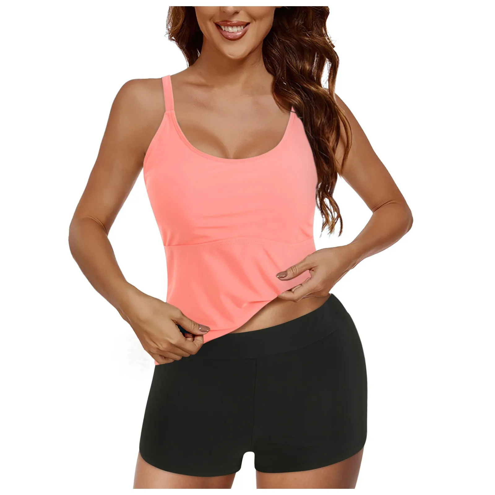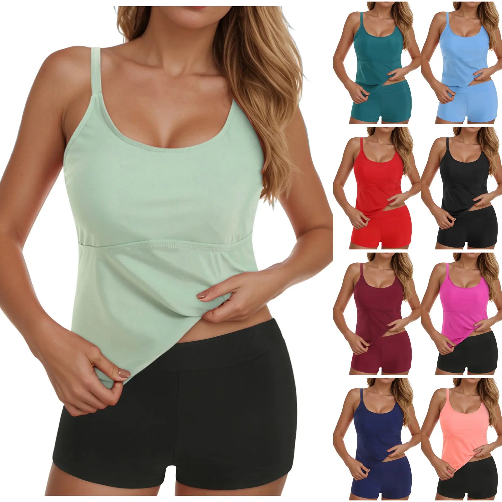 Tankini Style:Sleeveless tankini top paired with matching shorts, offering comfort and coverage for beach activities.