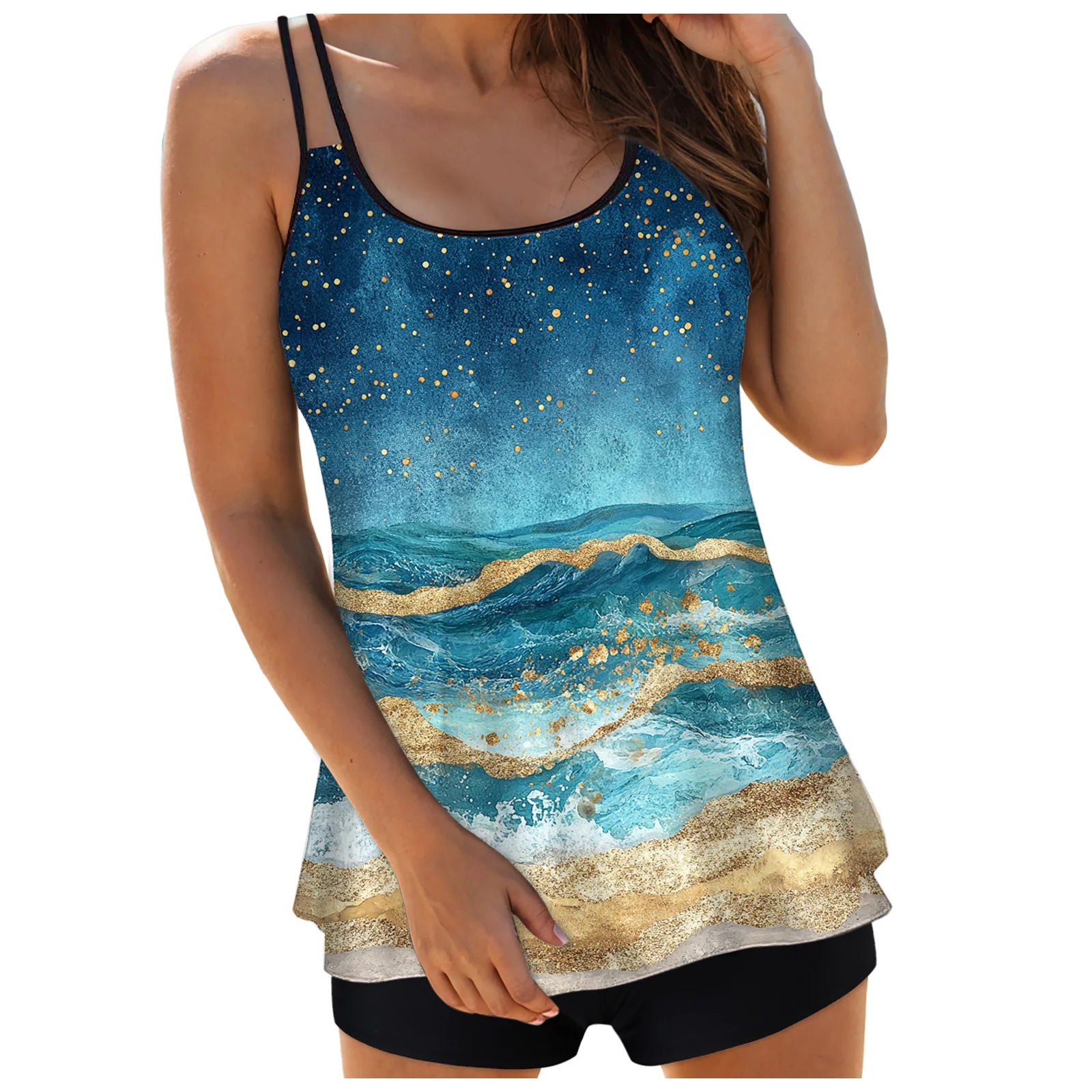 This women's tankini features an abstract print top with double stretch straps and a crew neck, designed to provide comfortable coverage and support. The tummy-covering silhouette helps create a flattering shape, while the solid shorts ensure modesty and ease of movement. Ideal for those seeking conservative swimwear without sacrificing style or functionality.