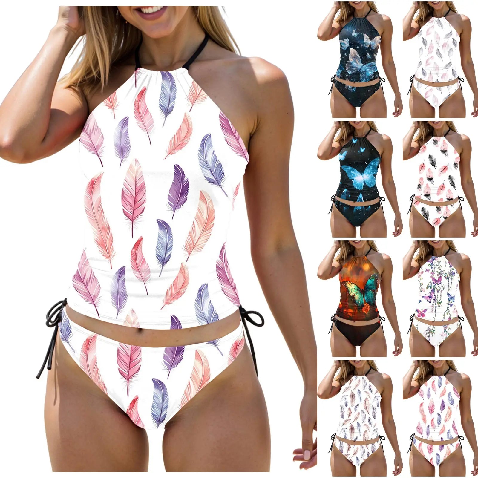 This women's butterfly print tankini offers a stylish yet modest swimwear option featuring a conservative backless design with a hanging neck. The top provides tummy coverage for added confidence, while the mid-waist swim shorts include a drawstring for a secure, adjustable fit. Ideal for those seeking both comfort and flattering support while enjoying water activities.