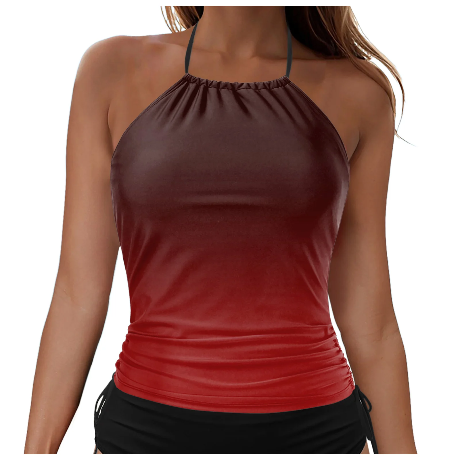 This women's gradient tankini swimsuit combines style and functionality for your holiday wardrobe. Featuring a hanging neck design, tummy-covering suspender top, and mid-waist solid color shorts with side ties, it offers comfortable support and a flattering fit. Ideal for swim and beachwear, this set balances coverage with contemporary flair, ensuring confidence and comfort during your holiday activities.