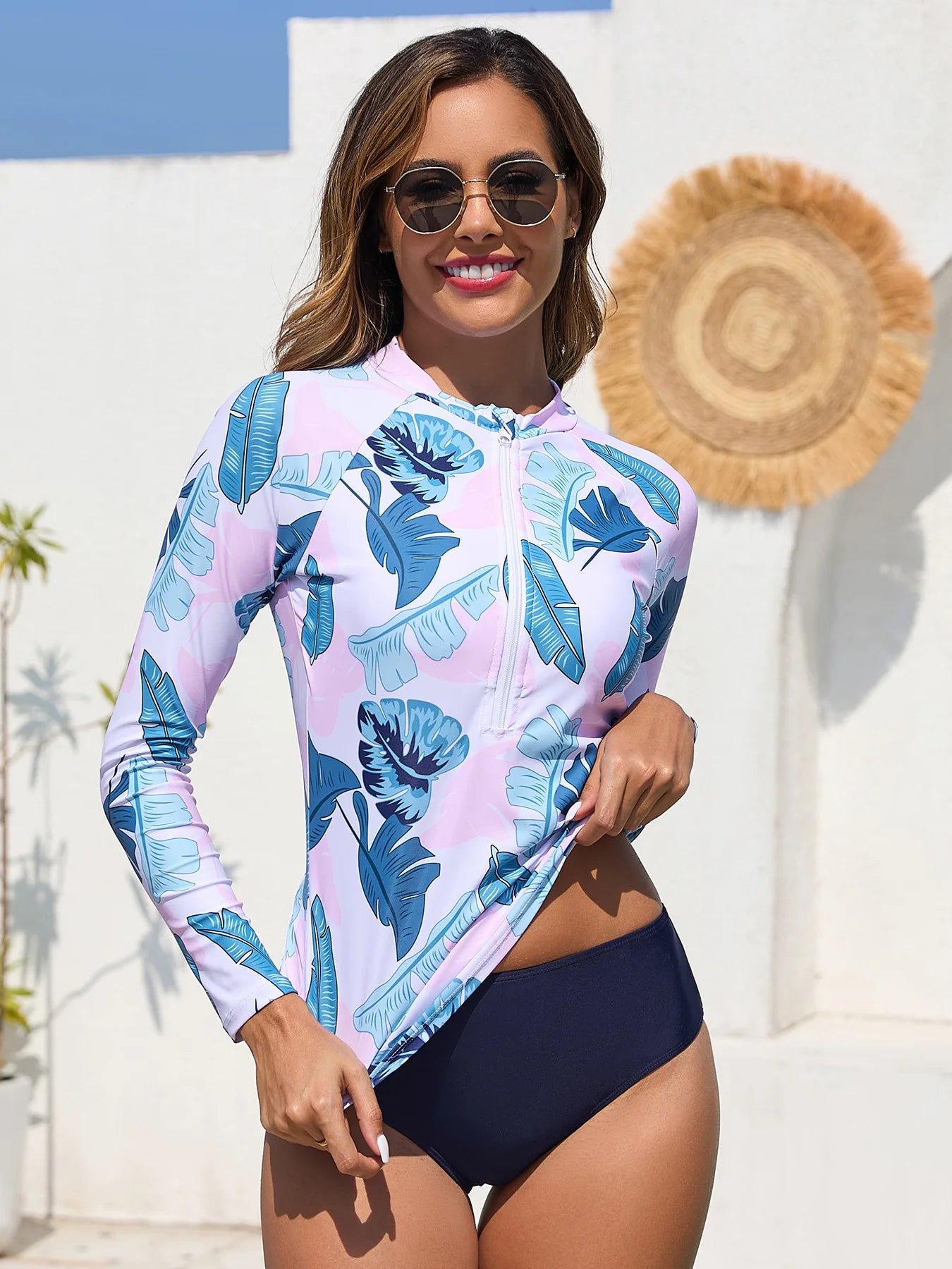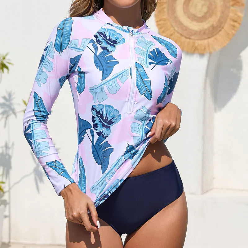 This women's two-piece tankini set features long sleeves and includes matching shorts, designed for active water sports like surfing and swimming. Crafted for comfort and coverage, it offers protection from the sun while allowing freedom of movement. Ideal for poolside, beachwear, or any aquatic activity, this set combines style with practical performance.