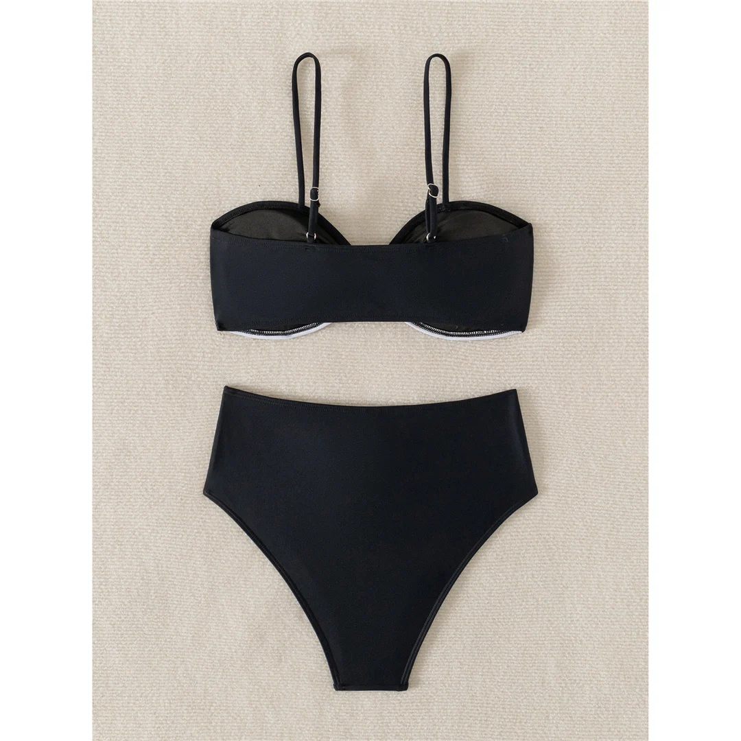 This two-piece women's swimsuit features a high-waist bikini bottom and a stylish splicing design with metal ring accents, combining fashion with functionality. Available in sizes XS to L, it offers a flattering fit that enhances your silhouette while providing comfortable support for swimming and beach activities. Crafted for durability and style, this bikini set is an excellent choice for those seeking both elegance and performance in swimwear.
