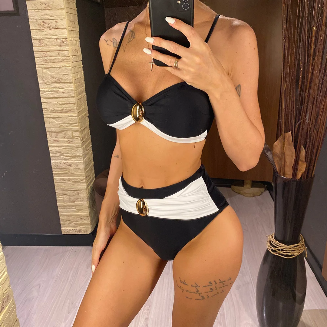 XS - L Splicing Metal Ring Female Swimsuit High Waist Bikini Women Swimwear Two-pieces Bikini set Bather Bathing Suit Swim